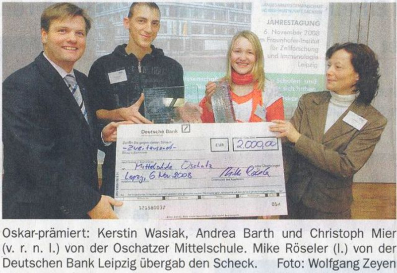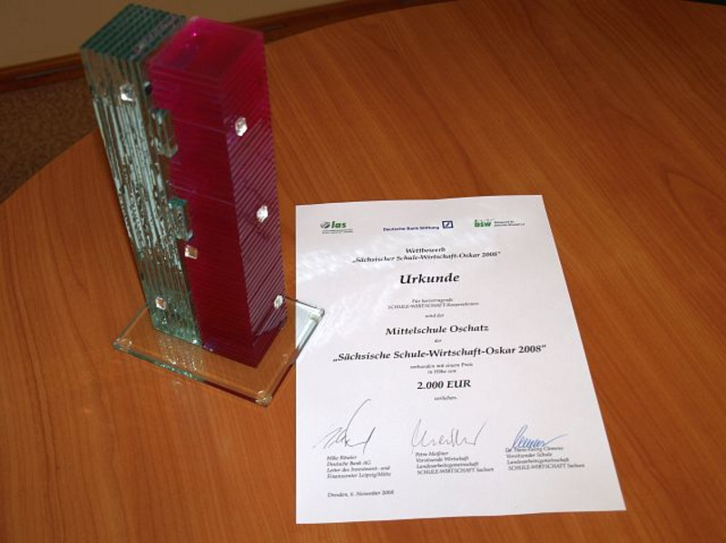 Der Sächsische Schule-Wirtschaft-Oskar 2008 geht an die Mittelschule Oschatz. Diese Anerkennung ist mit einem Preisgeld in Höhe von 2000,00 Euro verbunden. Sponsor des Preises ist die Deutsche Bank Stiftung.