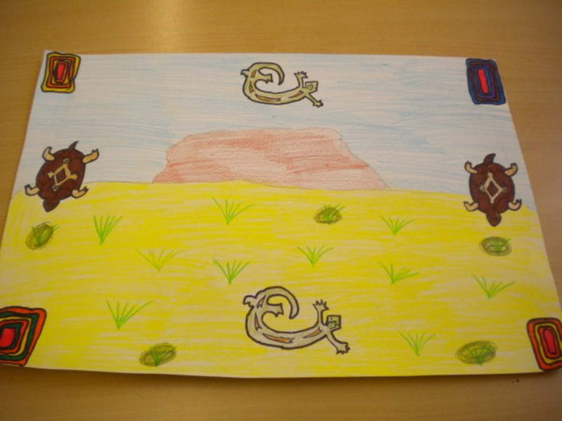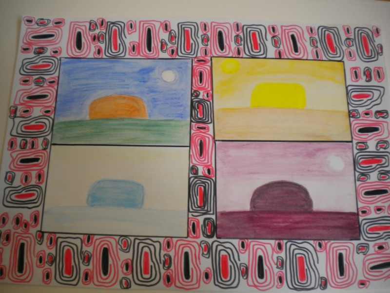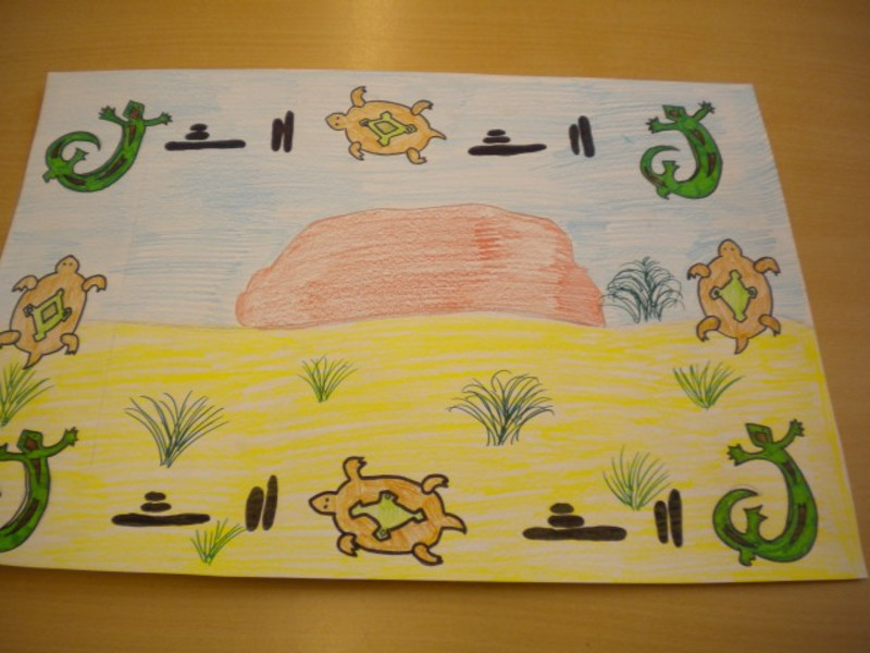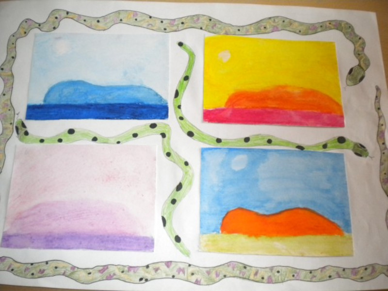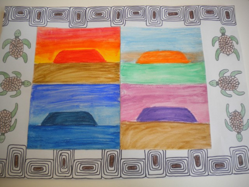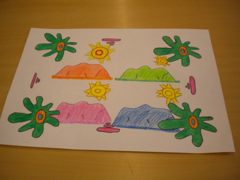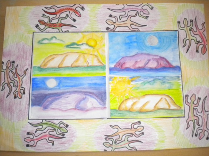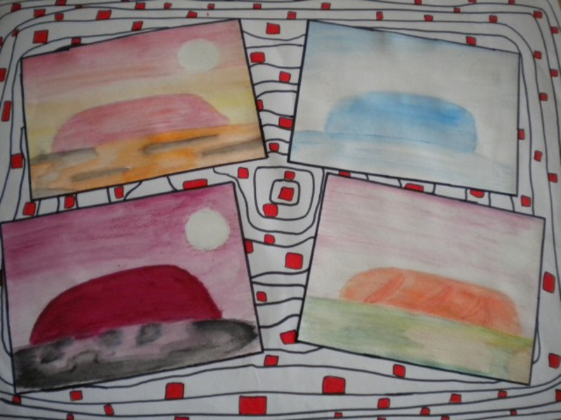 Die Arbeiten zeigen den Uluṟu ("Schatten spendender Platz") oder auch bekannt als "Ayers Rock". Sie entstanden in einer Zusammenarbeit zwischen Kunst- und Englischunterricht.