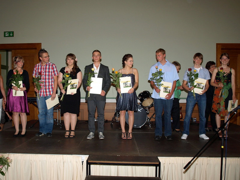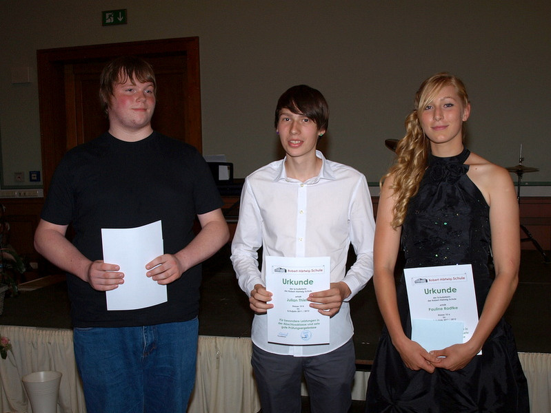 Am 20.07.2012 erhielten die Absolventen des Real- und Hauptschulbildungsganges der Klassen 9d, 10a und 10b ihre Abschlusszeugnisse. In der stimmungsvoll durch die Schulband in Szene gesetzten Feierstunde wurden nicht nur die Zeugnisse überreicht, sondern darüber hinaus auch die besten Schülerinnen und Schüler des Jahrganges durch den Förderverein der Schule ausgezeichnet. Mit beeindruckenden Worten bedankten sich die Schüler bei ihren Eltern sowie den Lehrern und Angestellten der Robert-Härtwig-Schule Oschatz für die jahrelange Unterstützung. Nach dem offiziellen Teil fand im Thomas-Müntzer-Haus die Abschlussfeier statt, wieder mit einem von den Schülern präsentierten Programm. Bis in die Nachtstunden hinein wurde ausgelassen gefeiert. (DU)