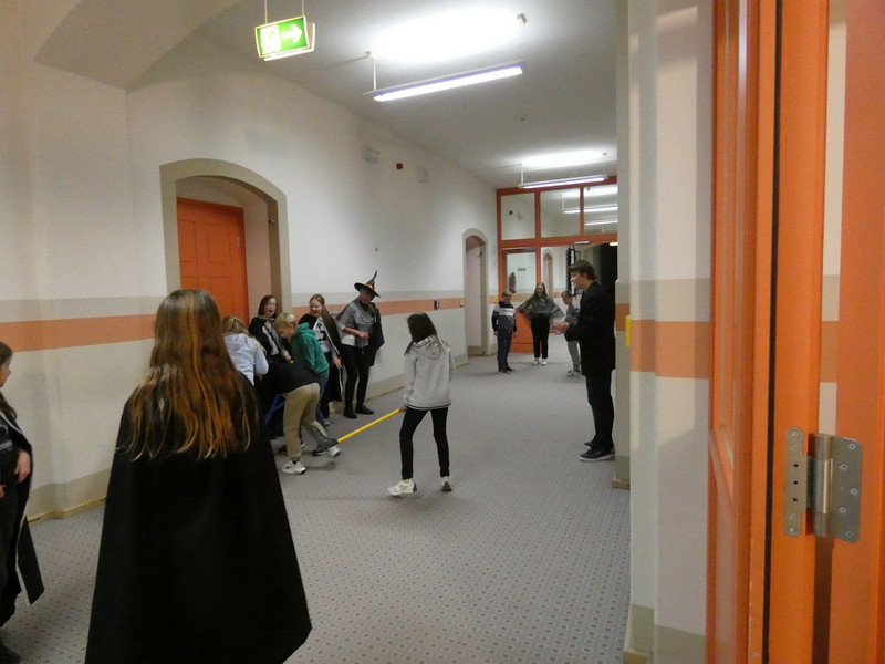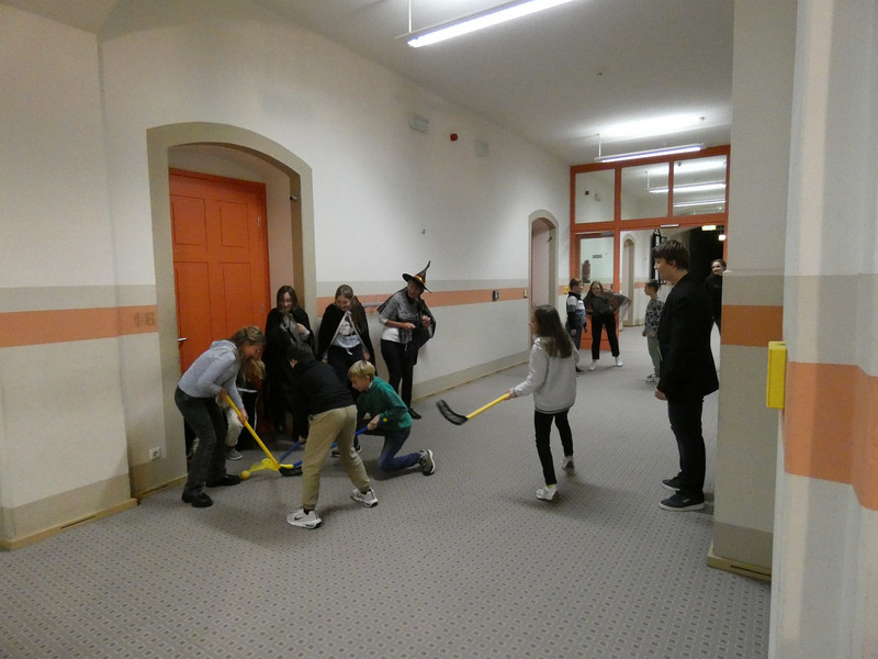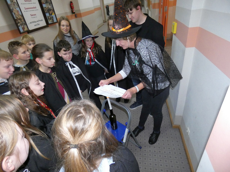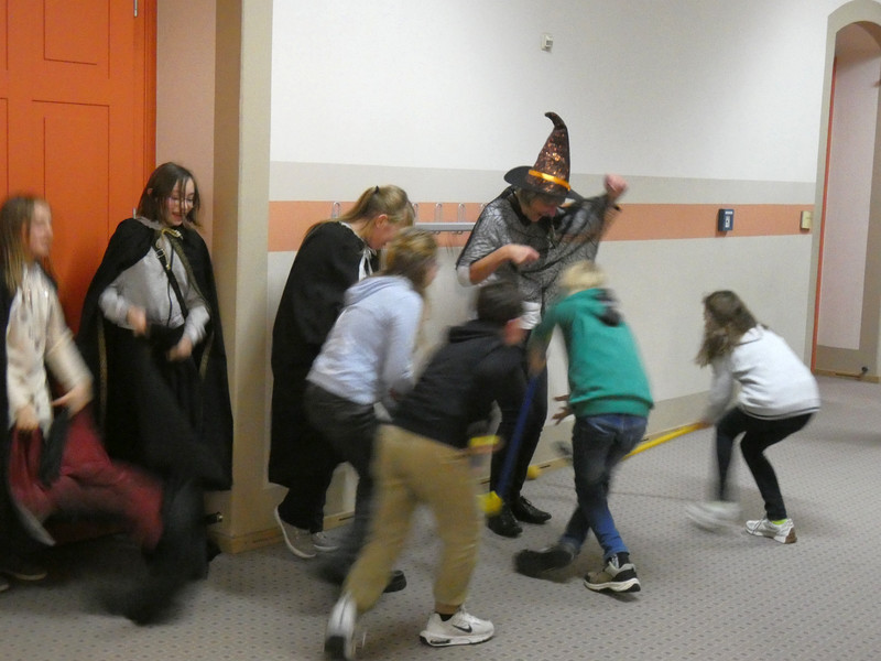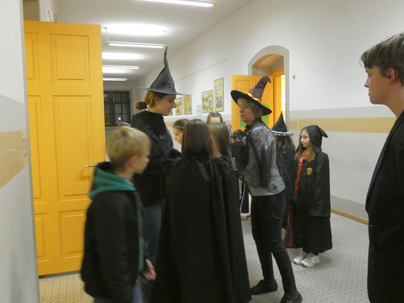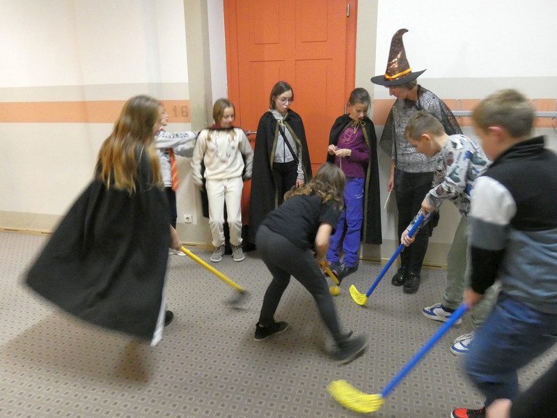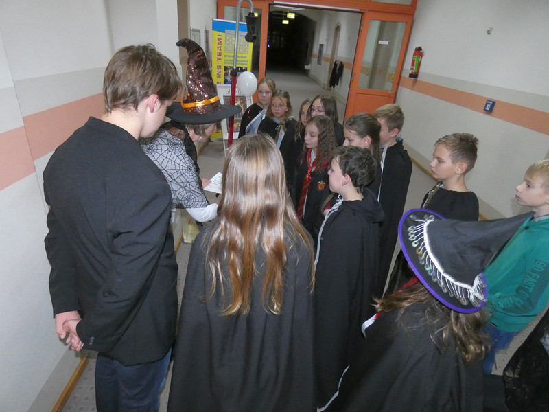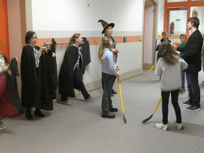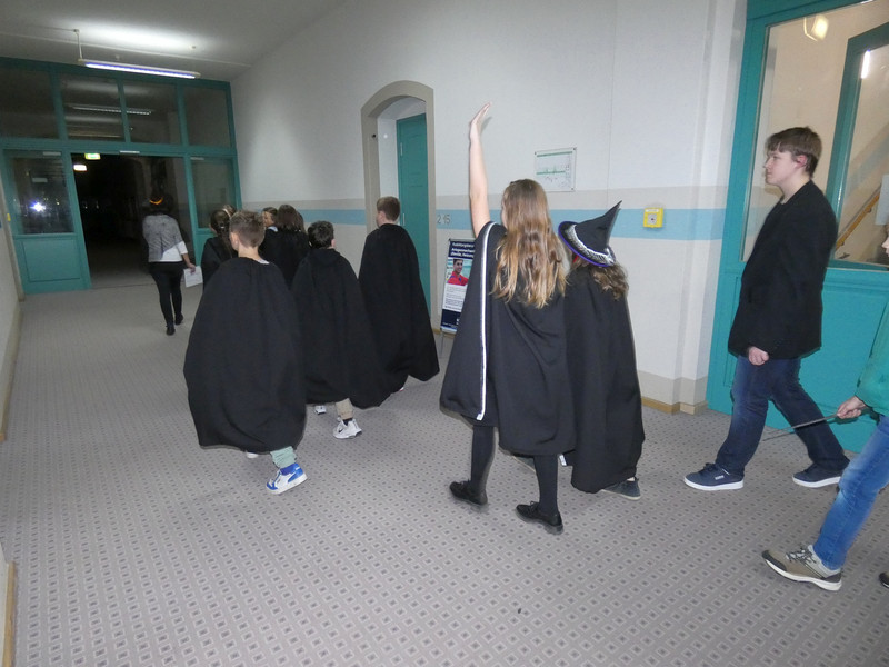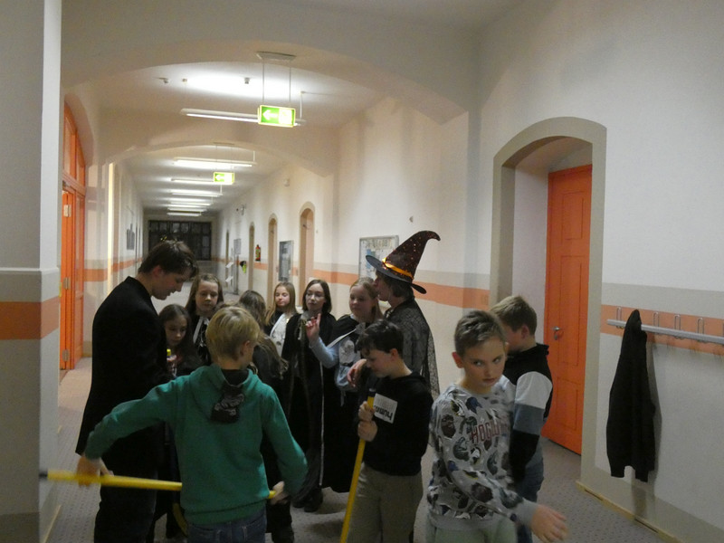 Leider hatte Frau Koine keinen Schlüssel!!! Aber die Eule „Hedwig“ hat die Nachricht hinterlassen. Eine Botschaft mit unsichtbarer Schrift. Aber wir waren ja Zauber und konnten schnell mit etwas Kerzenlicht die Zimmernummer erraten. Schließlich fanden die Schüler den Schlüssel in einer versteckten Truhe. Jetzt waren alle gespannt, wie der Festsaal aussah. Schwebende Kerzen erleuchteten den Raum und es gab leckeres gruseliges Essen, auch der Zaubertrank schmeckte prima. Die erste Zauberstunde begann und es wurde ein Zauberwasser zubereitet, welches dann jeder in eine kleine Glasflasche abfüllen konnte. Lustig war dann natürlich noch das Quidditsch-Spiel auf den Flur. Die Mannschaften, Jungen gegen Mädchen, feuerten sich gegenseitig an. Für jeden gab es einen Gewinn.