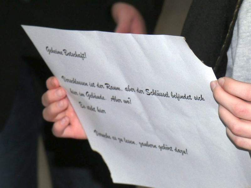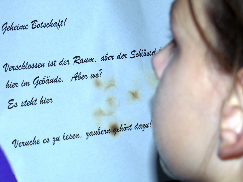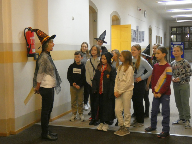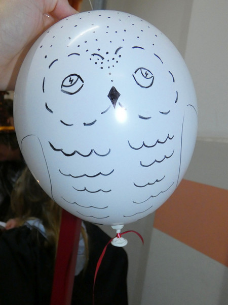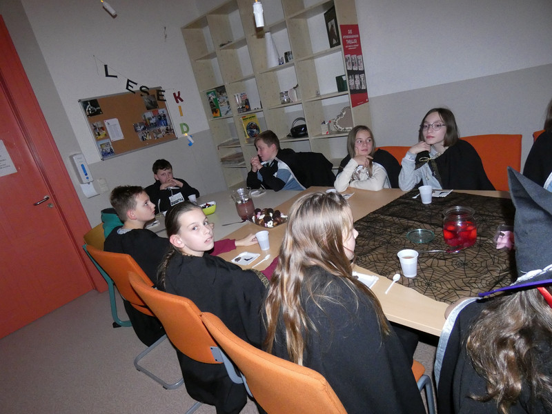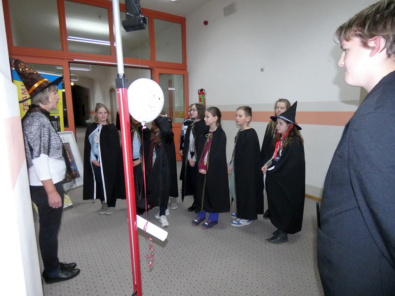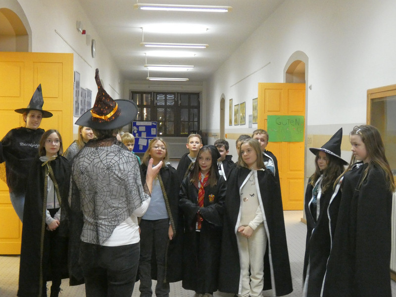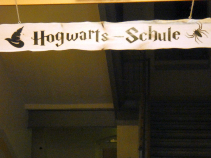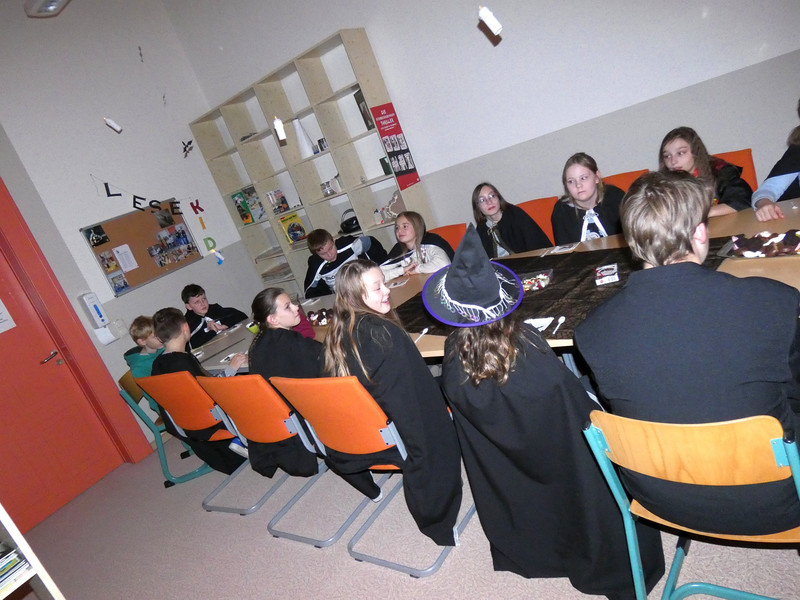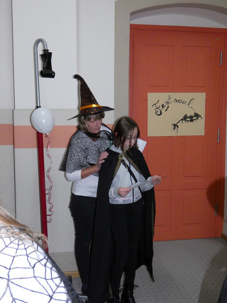 Leider hatte Frau Koine keinen Schlüssel!!! Aber die Eule „Hedwig“ hat die Nachricht hinterlassen. Eine Botschaft mit unsichtbarer Schrift. Aber wir waren ja Zauber und konnten schnell mit etwas Kerzenlicht die Zimmernummer erraten. Schließlich fanden die Schüler den Schlüssel in einer versteckten Truhe. Jetzt waren alle gespannt, wie der Festsaal aussah. Schwebende Kerzen erleuchteten den Raum und es gab leckeres gruseliges Essen, auch der Zaubertrank schmeckte prima. Die erste Zauberstunde begann und es wurde ein Zauberwasser zubereitet, welches dann jeder in eine kleine Glasflasche abfüllen konnte. Lustig war dann natürlich noch das Quidditsch-Spiel auf den Flur. Die Mannschaften, Jungen gegen Mädchen, feuerten sich gegenseitig an. Für jeden gab es einen Gewinn.