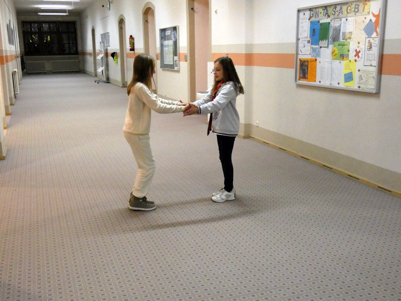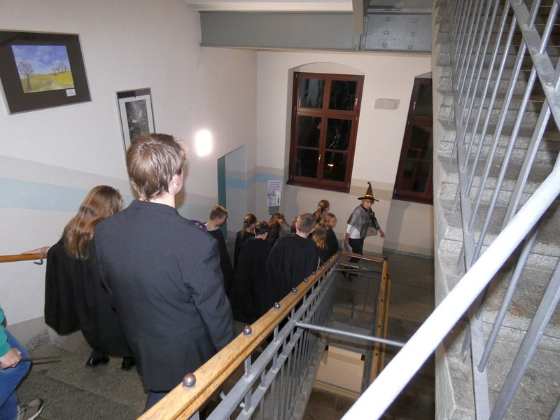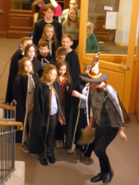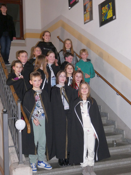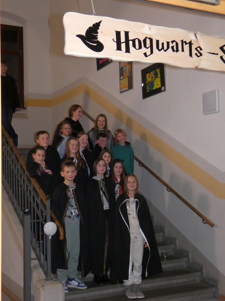 Einige Schüler der Klassen 5 warteten voller Spannung an der Eingangstür. Sie hatten nämlich eine Einladung zur Aufnahme in der Hogwarts-Schule für Hexerei und Zauberei erhalten. Und tatsächlich, mit großen Buchstaben stand da der Name der Schule. Frau Koine mit ihren zwei Gehilfen empfing die neuen Schüler. Als erstes bekamen alle Schüler einen schwarzen Umhang, die Schulkleidung der Hogwardschule. Nach der Begrüßung ging es die schwebenden Treppen zum Festsaal hinauf.