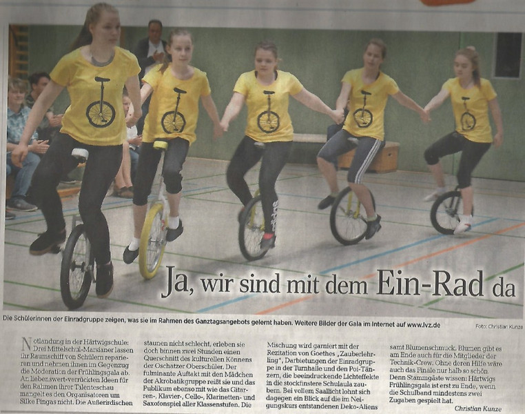 Der fulminante Auftakt mit den Mädchen der Akrobatikgruppe reißt sie und das Publikum ebenso mit wie die das Gitarren-, Klavier-, Cello-, Klarinetten- und Saxofonspiel aller Klassenstufen. Die Mischung wird garniert mit der Rezitation von Goethes „Zauberlehrling“, Darbietungen der Einradgruppe in der Turnhalle und den Poi-Tänzern, die beeindruckende Lichteffekte in die stockfinstere Schulaula zaubern. Bei vollem Saallicht lohnt sich dagegen ein Blick auf die im Neigungskurs entstandenen Deko-Aliens samt Blumenschmuck. Blumen gibt es am Ende auch für die Mitglieder der Technik-Crew. Ohne deren Hilfe wäre auch das Finale nur halb so schön. Denn Stammgäste wissen: Härtwigs Frühlingsgala ist erst zu Ende, wenn die Schulband mindestens zwei Zugaben gespielt hat.