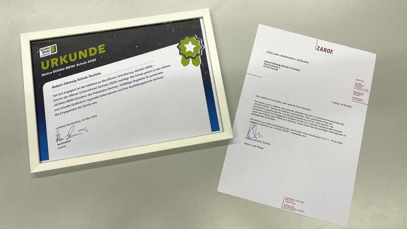 Die Robert-Härtwig-Schule Oschatz gehörte zu den aktivsten Schulen im Landkreis Nordsachsen bei der "SCHAU-REIN!" Woche der offenen Unternehmen. Aus diesem Grund erhielten wir eine Urkunde mit Prämien-Scheck von Landrat Kai Emuanuel.