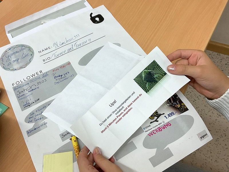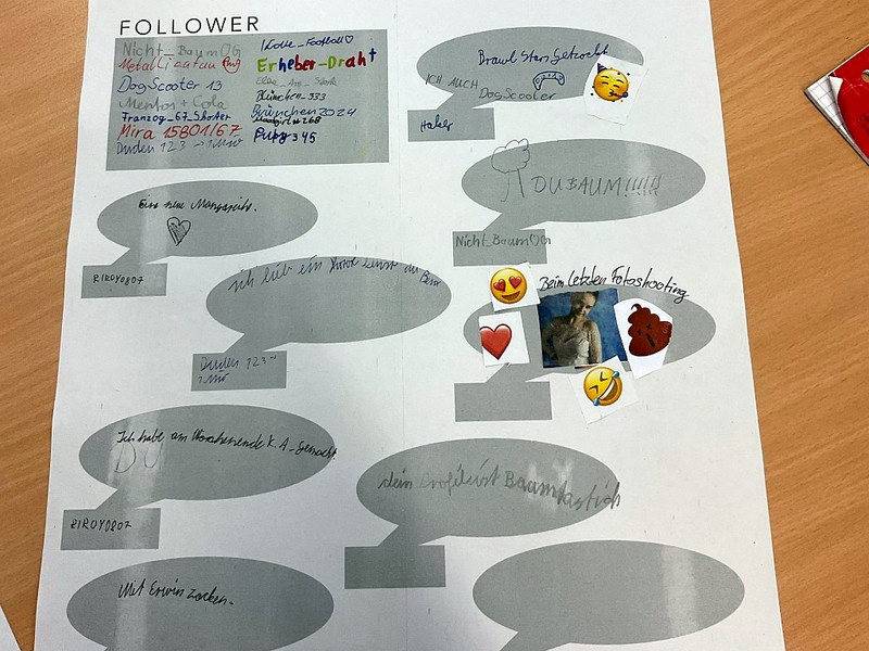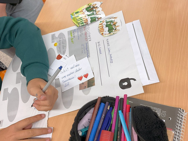 Nach einer kurzen Einführung, bei der die Schülerinnen und Schüler ihre bisherigen Erfahrungen schildern konnten, wurde eine „neue App“ vorgestellt – allerdings in analoger Form. Jedes Kind erhielt ein großes Blatt Papier, auf dem es ein eigenes imaginäres Profil gestalten durfte: mit Nickname, Bild, Bio, Postings und sogar Datenschutzeinstellungen.