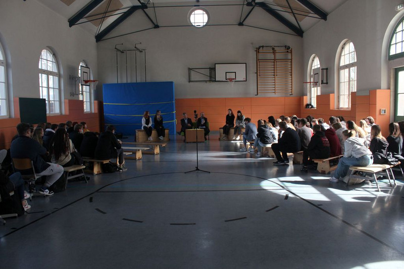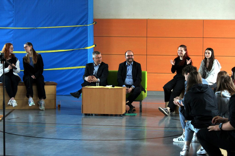 Als es dann an der Zeit war, gingen wir über den Anbau zusammen in die Turnhalle, wo schon die Schülerinnen und Schüler der 9. und 10. Klasse, die teilnehmen wollten, Platz genommen hatten. Herr Pallas und auch ebenfalls Herr Piwarz setzten sich nach ihrem Eintritt auf das Sofa, welches für sie extra platziert wurde. Dann begann die Fragerunde. Schülerinnen und Schüler konnten ihre Fragen stellen und das taten sie nach anfänglicher Zurückhaltung auch. Letztendlich konnten gar nicht alle aufkommenden Fragen beantwortet werden. Dafür hat die Zeit nicht mehr gereicht. Herr Pallas und Herr Piwarz antworteten jeder Frage mit gelungenen Antworten, egal ob auf persönliche oder politische Fragen.