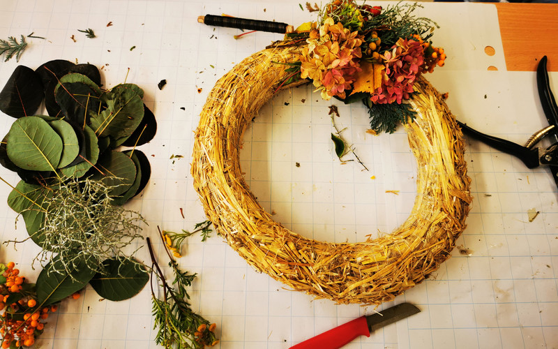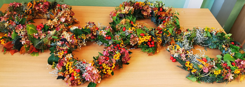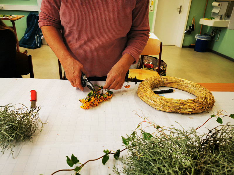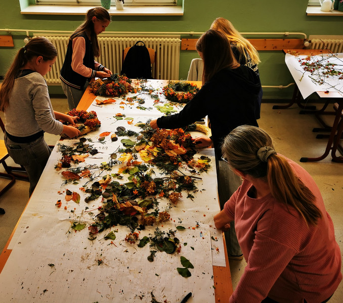 Nach der Demonstration durften die Schülerinnen selbst Hand anlegen und unter Anleitung ihren eigenen Kranz gestalten. Mit viel Begeisterung, Kreativität und Geduld entstanden am Ende wunderschöne, individuelle Werkstücke. Die Freude über das eigene Ergebnis war bei allen deutlich zu sehen.