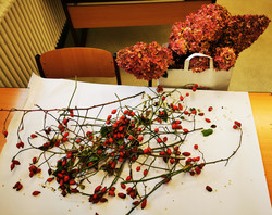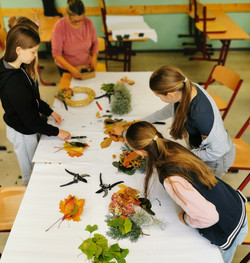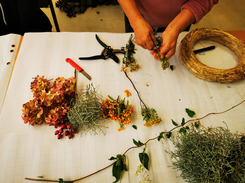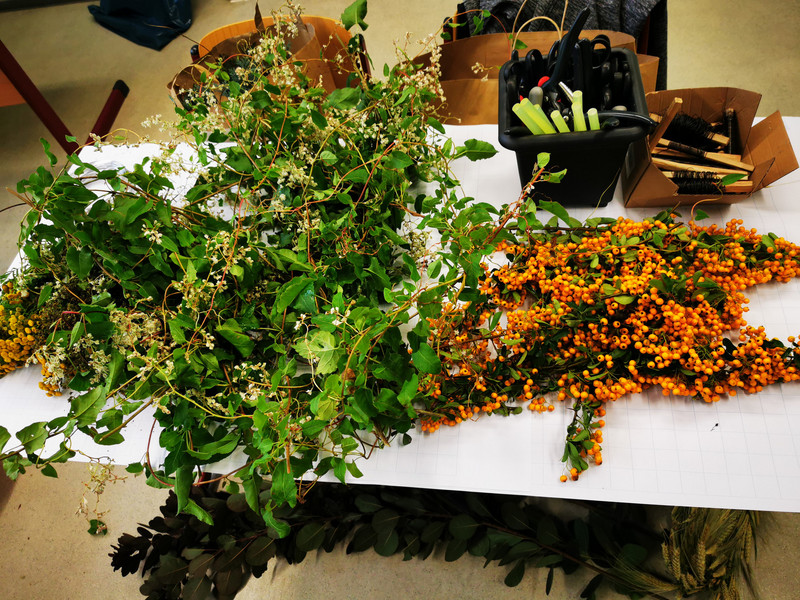 Im Anschluss stellte sie das geplante praktische Projekt vor und zeigte die Materialien, die sie mitgebracht hatte. Gemeinsam mit den Schülerinnen ging sie die einzelnen Materialien durch, erklärte deren Verwendung und zeigte schließlich Schritt für Schritt, wie man einen Kranz bindet. Dabei erläuterte sie die wichtigsten Techniken und Kniffe, auf die es bei der Gestaltung ankommt – von der Auswahl der Zweige über das Binden bis zur Dekoration.