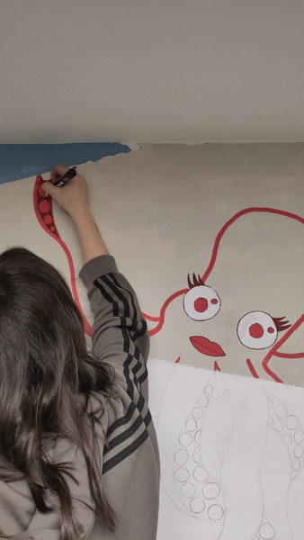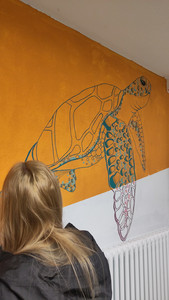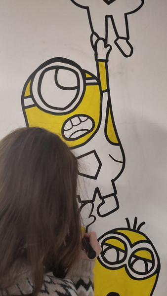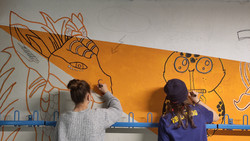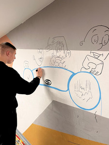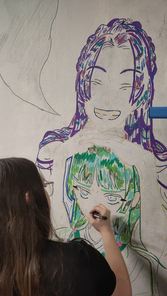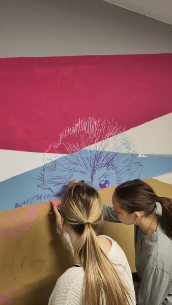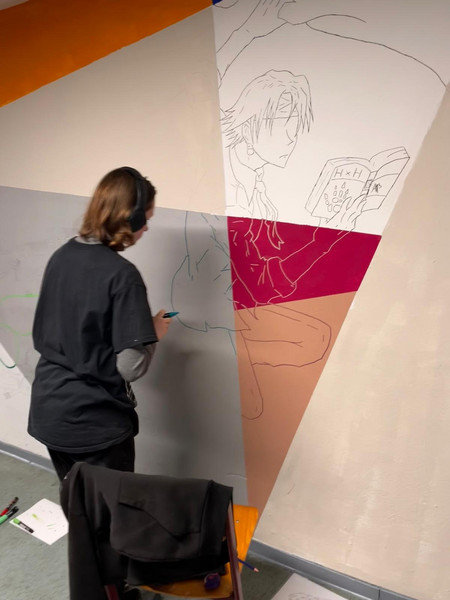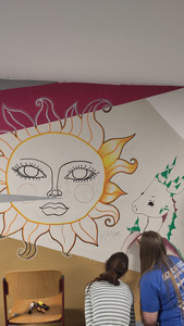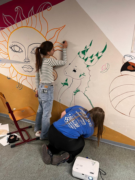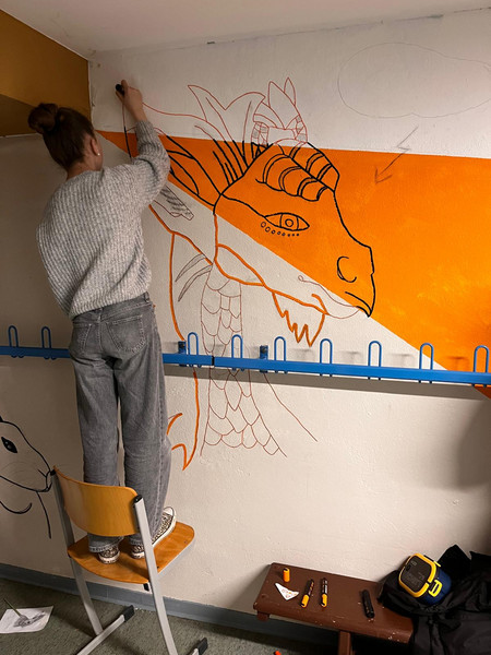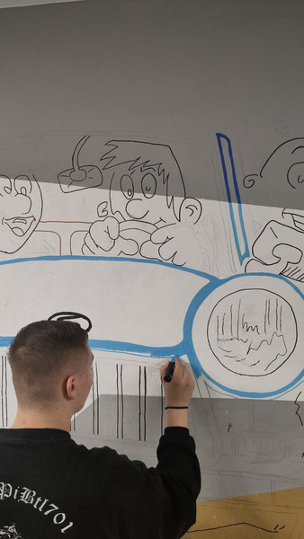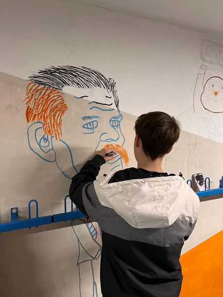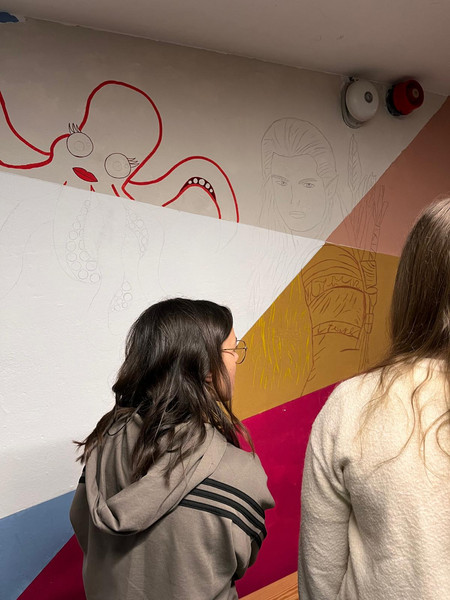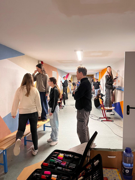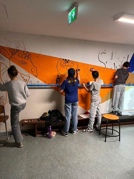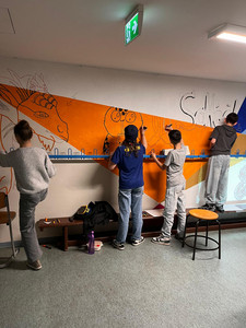 Diese besondere Vielfalt wird in einem künstlerischen Projekt im Kellergang unserer Schule sichtbar gemacht. Das entstandene Wandbild zeigt eine außergewöhnliche Begegnung: Figuren, Tiere, Menschen und Gegenstände treffen aufeinander – Konstellationen, die es so im Alltag nie geben würde. Gleichzeitig trägt das Projekt dazu bei, den Schülerinnen und Schülern eine angenehme Atmosphäre zu schaffen. Besonders im Schulclub am Nachmittag soll so ein Ort entstehen, an dem sie sich wohlfühlen und ein positives, gemeinschaftliches Miteinander erleben können.