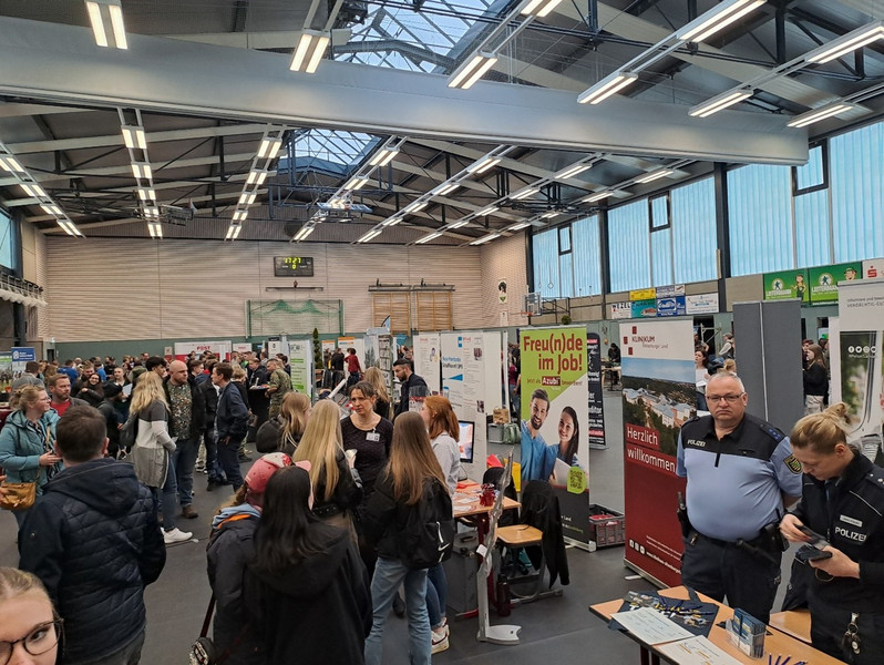 Am 13.03.2024 fand zum 10. Mal der "Tag der Ausbildung" an der Oberschule Frohburg statt. Ab 15.30 Uhr trafen die ersten Aussteller ein und bauten ihre Messestände auf. Selbst vor der Halle fand man einen Schlepper der Firma Friedrich Land- und Gartentechnik GmbH aus Bad Lausick und ein Ausstellungsstück der Firma Baugeschäft Franke GmbH aus Frohburg, welche auf die Messe schon von weitem hinwiesen. Kurz vor 17 Uhr war es so weit, die ersten Besucher strömten in die Sporthalle in Frohburg. Unter den Ausstellern waren viele verschiedene Firmen dabei. Von der Pflege, über das Handwerk, die Landwirtschaft und Verwaltung bis hin zu Polizei und Bundeswehr, war alles vertreten. Auch die Beruflichen Schulzentren aus Rochlitz und Böhlen stellten sich vor. Viele Schülerinnen und Schüler kamen gemeinsam mit ihren Eltern und nutzten die Möglichkeit, zu den Firmen Kontakt aufzunehmen und wichtige Informationen bezüglich der Ausbildung zu erfragen. Kontaktdaten wurden ausgetauscht. Für die Schülerinnen und Schüler, die noch keine Vorstellung von möglichen Ausbildungsberufen hatten, war die Bundesagentur für Arbeit vor Ort und stand mit Rat und Tat zur Seite. Die Schülerfirma versorgte die Gäste mit Speisen und Getränken.