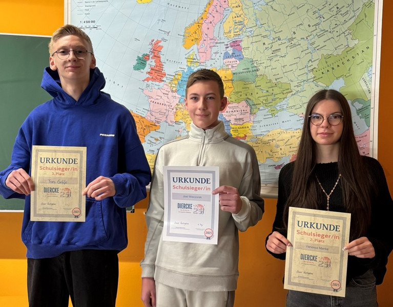 Joelaus der Klasse 8c der „Maxim Gorki“ Oberschule hat an Deutschlands größtem Geographiewettbewerb teilgenommen und den Sieg auf Schulebene erlangt. Beim internen Ausscheid von interessierten Schülern der Klassen 7-9 erreichte er mit 23 Punkten eine sehr gute Leistung. Vanessa Manke und Toni Gräfe aus der Klasse 9c belegten die Plätze 2 und 3. Joel qualifizierte sich damit für den Landesausscheid Ende März. Hier hat er starke Gegner aus allen Schularten Sachsens. Die Aufgaben haben höchsten Anspruch nicht nur aus der Schulgeographie.