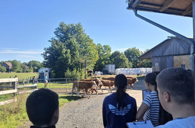 Nach unserer Ankunft wurden wir in zwei Gruppen eingeteilt. Meine Gruppe begann mit dem Besuch bei den Kühen. Ein Landwirt erzählte uns dort von seinem Beruf und beantwortete unsere zahlreichen Fragen – denn unsere Aufgabe war es, ein Interview zu führen. Dabei habe ich unter anderem gelernt, dass auf dem Hof besonders darauf geachtet wird, dass die Kühe ihre Hörner behalten. Außerdem haben die Tiere – insbesondere die tragenden Kühe – viel Platz zur Verfügung.