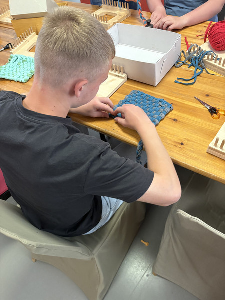 Nach einer kurzen Einführung in die Funktionsweise historischer Webstühle hatten die Kinder die Möglichkeit, an einem echten Webstuhl zu arbeiten. Mit viel Neugier und Geschick probierten sie sich außerdem am Webrahmen aus – jeder stellte dabei seinen eigenen bunten Topflappen her, der als schönes Andenken mit nach Hause genommen werden durfte.