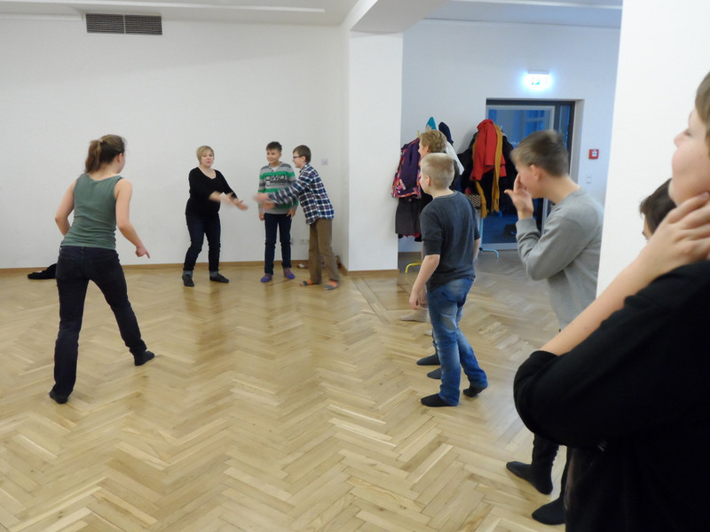 Montag: Heute starteten wir mit einem Improvisationsworkshop in den Landesbühnen in die Projektwoche. Durch diese begleiten uns die Theaterpädagogen Anna-Sophia Fritsche und Elisabeth Guzy sowie Mirjam Richter, Bundesfreiwilligendienstlerin.