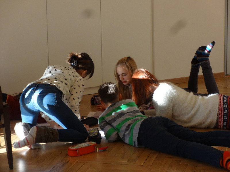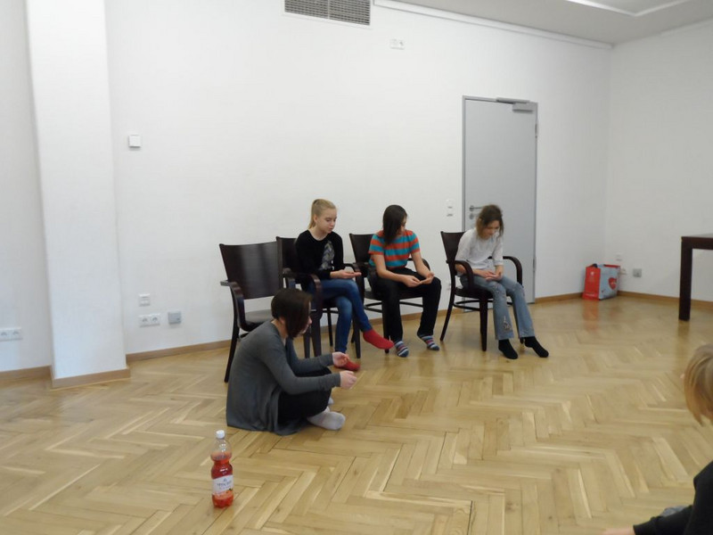 Dienstag: Am Anfang haben wir wieder Spiele gemacht, die uns auf das Theaterspielen vorbereiteten. In kleinen Gruppen besprachen wir erste Ideen zum Thema „Labyrinth“. (Petra 6a)