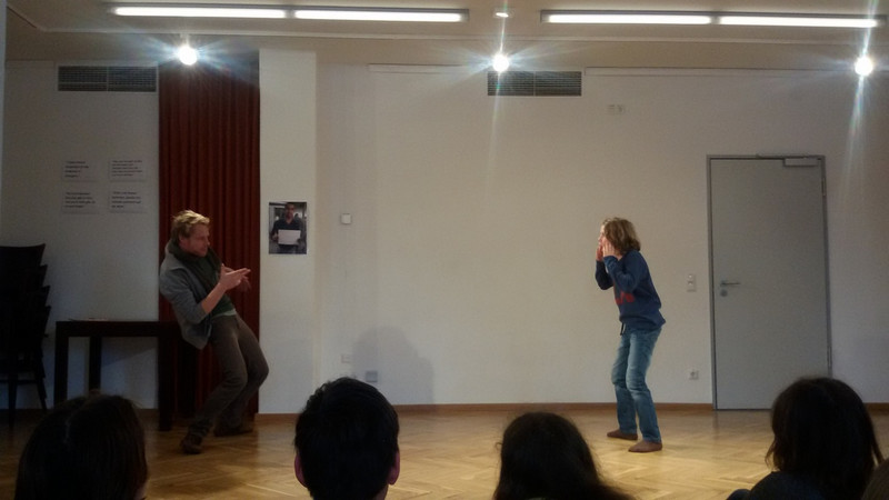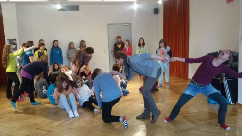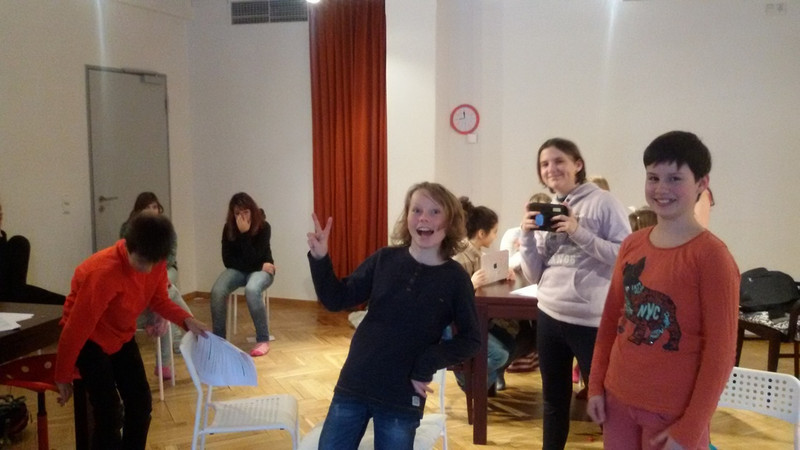 Mittwoch: Als erstes haben wir uns aufgewärmt, dann haben wir ein Spiel gespielt und über unser Stück diskutiert. Danach haben wir uns in Gruppen aufgeteilt und das Stück geschrieben. Zum Schluss haben wir es dann vor den anderen präsentiert. Ich finde es cool, dass wir unser Stück vor professionellen Schauspielern spielen können. (Domenic, 6b)