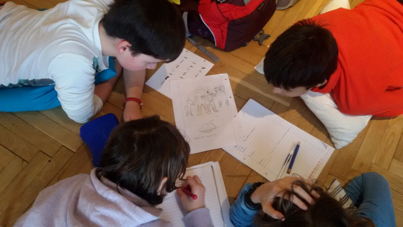 Heute haben wir angefangen unsere Stücke zu schreiben. Da wurden wir in Gruppen aufgeteilt. Danach haben wir die Stücke vorgestellt. (Emma 5b)