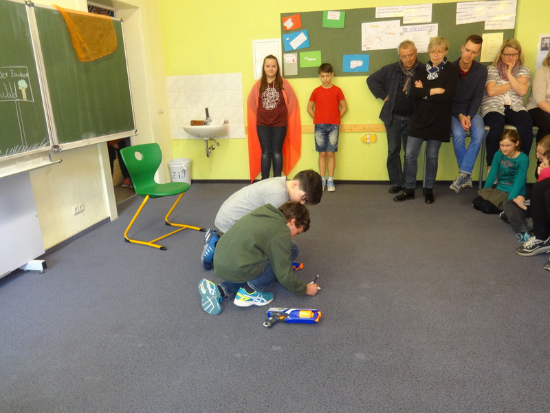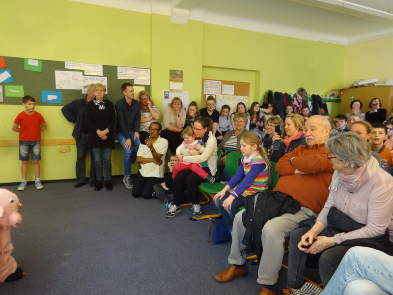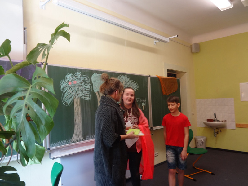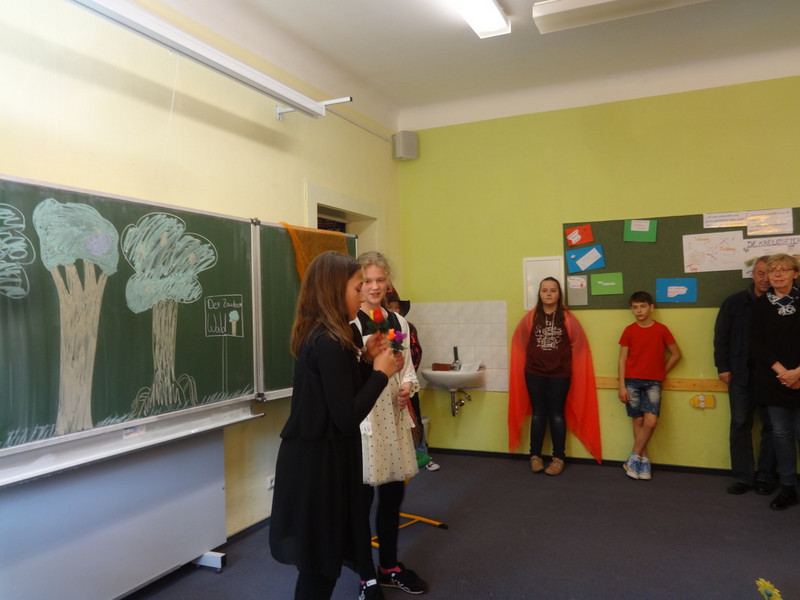 8:30, die Aufregung war groß. Nur noch einmal kurz üben und dann auf zur Generalprobe. Nach einer kurzen Pause und einem gemeinsamen Toi Toi Toi haben wir vor einem prall gefüllten Zimmer unsere Stücke aufgeführt. Das Publikum war begeistert. Ein super Tag! Ihr wart eine tolle Schauspieltruppe. Applaus! (Fr. Schade, Frau Goller, Frau Escher, Herr Trebing und Herr Israel)