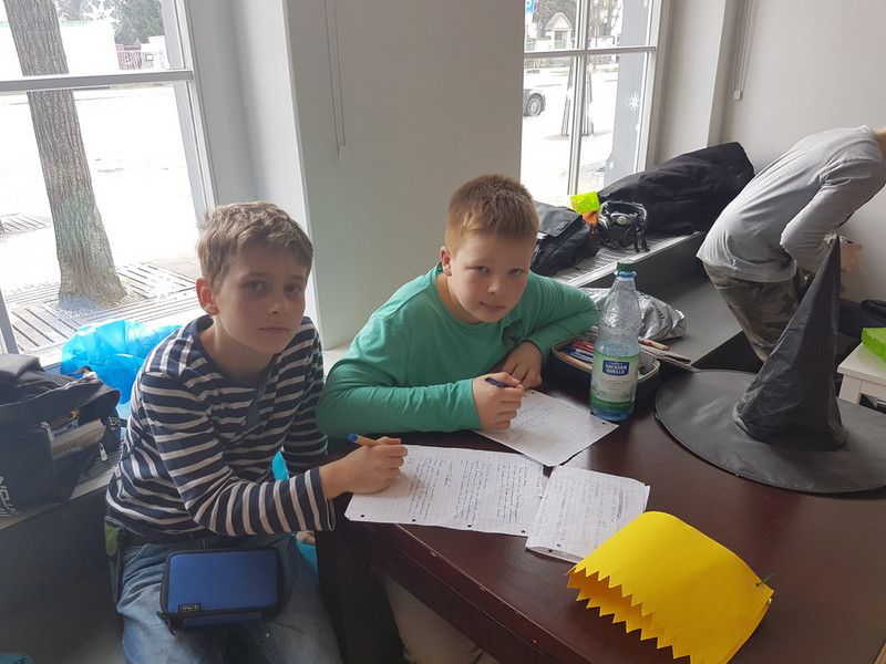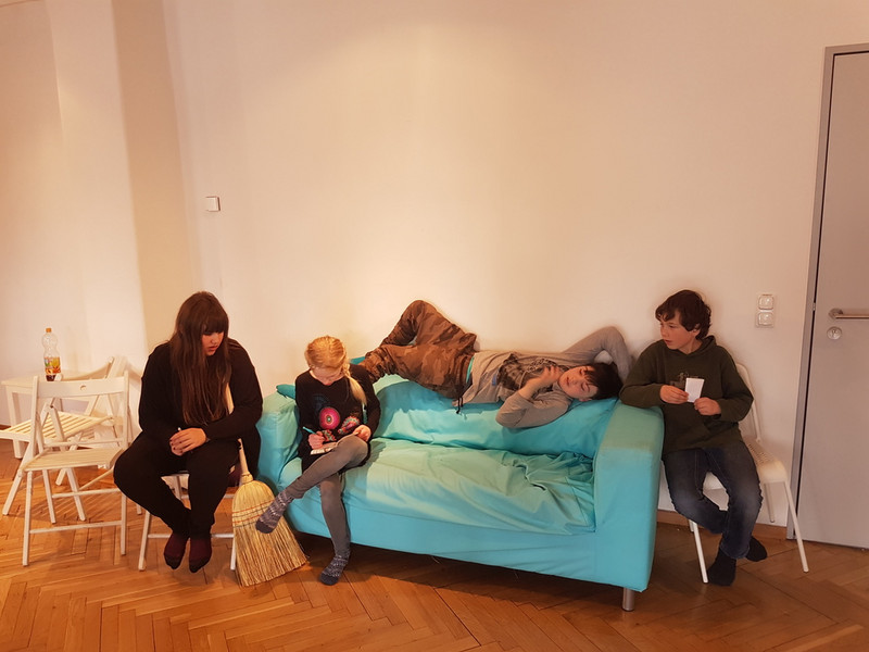 Vivien: "Heute haben wir lange, lange geprobt. Wir hatten auch Spaß. Heute früh haben wir ein Spiel gespielt, das heißt das Kotzende Känguru. Gleich kommt Steffen, er ist ein Schauspieler und Regisseur. Heute war es toll! Morgen ist die Aufführung. Ich freue mich schon!"