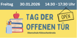 Herzlich willkommen zum Tag der offenen Tür am Freitag, 30. Januar 2026, an der OS Kötzschenbroda! Gern sind alle interessierten Besucher in der Zeit von 14:30 Uhr bis 17:30 Uhr eingeladen, in verschiedenen Klassenzimmern Lernmaterialien sowie beeindruckende Ergebnisse aus dem Unterricht und den schulischen Projekten anzuschauen und Neues zu entdecken. Schülerinnen und Schüler halten Präsentationen bereit, zeigen Experimente, informieren über die Schülerfirma und bereichern den Nachmittag durch unterhaltsame Programme. So erhalten unsere Gäste einen lebendigen Einblick in unseren abwechslungsreichen Schulalltag.