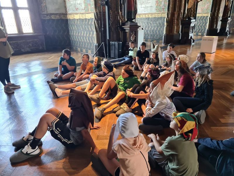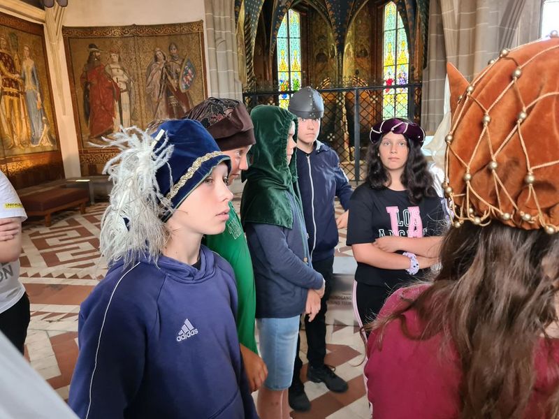Dadurch ging es durch viele Säle und Wendeltreppen. Dabei waren auch die vermuteten Schlaf- und Wohnzimmer von Albrecht und Ernst. Im Anschluss gingen wir in den Keller und konnten unsere Rollen abholen. Danach setzten wir uns, der Albrecht eröffnete die Tafel und wir aßen Kuchen und als Getränk gab es Apfelsaft und Wasser. Als wir die Führung geschafft hatten, waren wir alle positiv begeistert von dem, was wir erfahren haben. Es gab noch ein Eis und dann ging es auch schon in den Zug. Erschöpft fuhren wir nach Hause und der lange Tag war endlich geschafft.