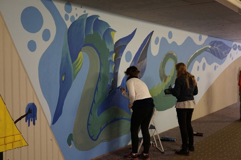Vom 09.08. – 12.08.2016 gestalteten 25 Schülerinnen und Schüler der Klassen 7 bis 10 unserer Schule acht große Wandflächen der Fußgängerunterführung am Haltepunkt Zitzschewig.