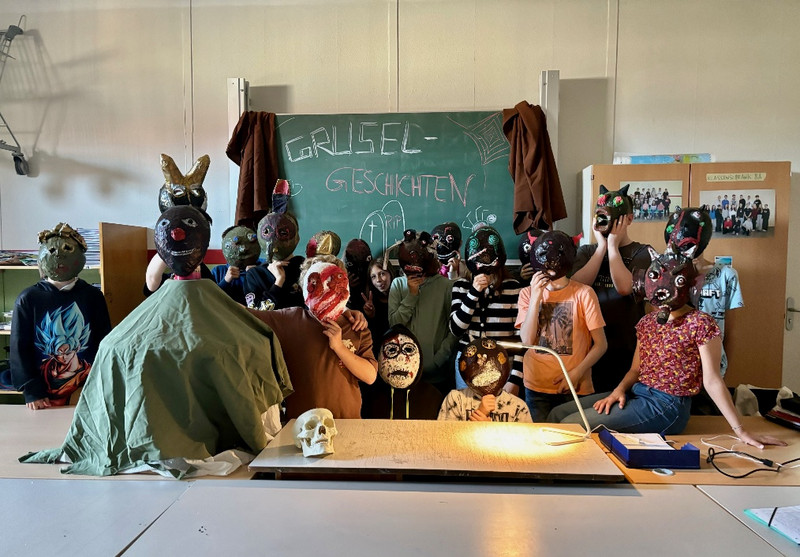 Werwölfe, Hexen, Zombies. In den 6. Klassen ging es in den letzten Wochen gruselig her. Im Kunstunterricht wurden aus den verschiedensten Materialien schaurig schöne Masken modelliert. Passend dazu schrieben die Schülerinnen und Schüler im Deutschunterricht eine Gruselgeschichte. Zum krönenden Abschluss wurden die Masken am Präsentationstag vorgestellt und die Geschichten vorgelesen. Gänsehaut garantiert!