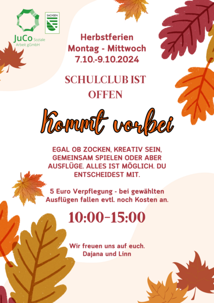 Vom 07.-09.10. 2024 (Mo bis Mi) ist der Schulclub von 10.00 bis 15.00 für euch geöffnet. Dajana und Linn freuen sich auf euch.