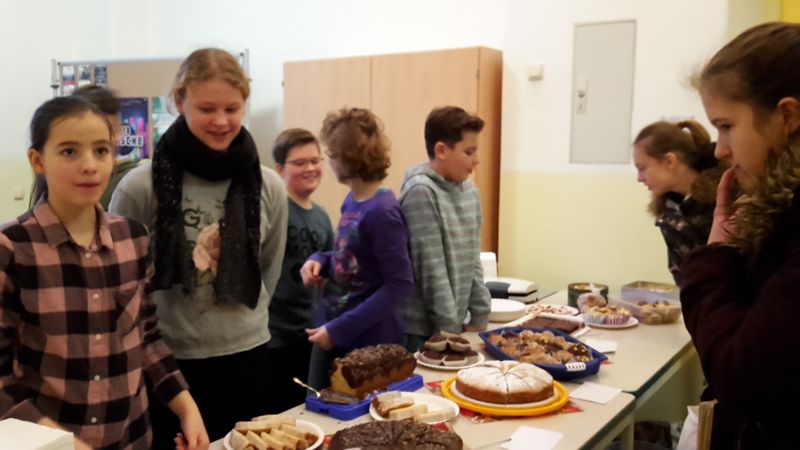 … heut rühr‘n wir Teig für Plätzchen ein.“ Dieser schönen Tradition folgend führte die Klasse 6b am Nikolaustag ihren Kuchenbasar durch. Schüler und Eltern haben fleißig gebacken und sogar Sandwiches geschmiert.