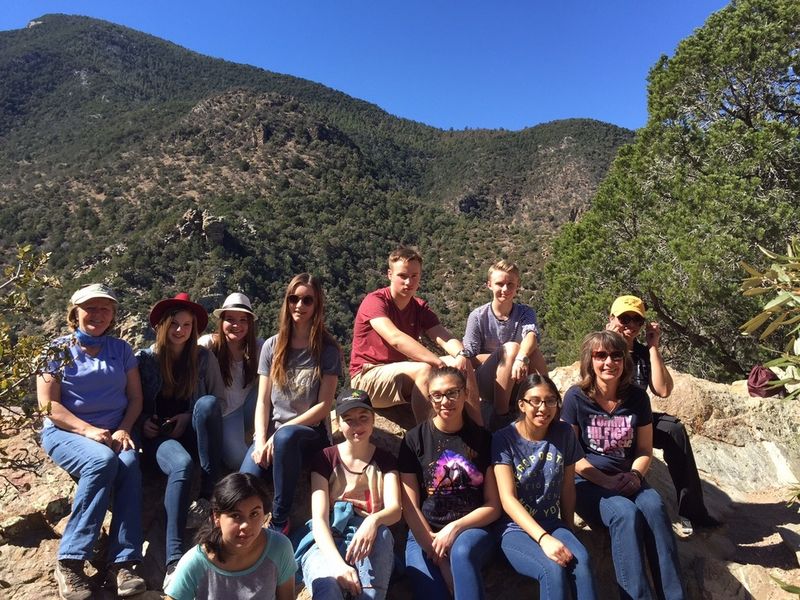 Thirteen high school students and two teachers from Radebeul, Germany, arrived in Sierra Vista late on Sunday, February 14. Sponsored by the Cityof Sierra Vista Sister Cities Commission, they come from several high schools in our German sister city. They will be here with local host families for about 3 weeks and will experience high school, see local sites, meet with city officials, travel to Phoenix to see the state capital, and spend several days with host families in our Mexican sister city of Cananea, Sonora. The sister cities program builds relationships among students in all three cities, and this trip is a reciprocation of the visit to Radebeul in 2015 by Buena high school students. Pictured is part of the group who hiked to Ramsey Overlook in the Huachuca Mountains on the morning of Presidents' Day. Left to right: back row: Councilwoman Henrietta Huisking (liaison to the Sister Cities Commission), Radebeul students: Julia Menzel, Rica Eichhorn, Sara Burghardt, and Fin Handschug, Buena student host Nick Schulz, Sister Cities Commissioner Irma Valdez. Front row: unidentified Buena student, Radebeul student Sarah Baumann, Buena students Stephanie and
