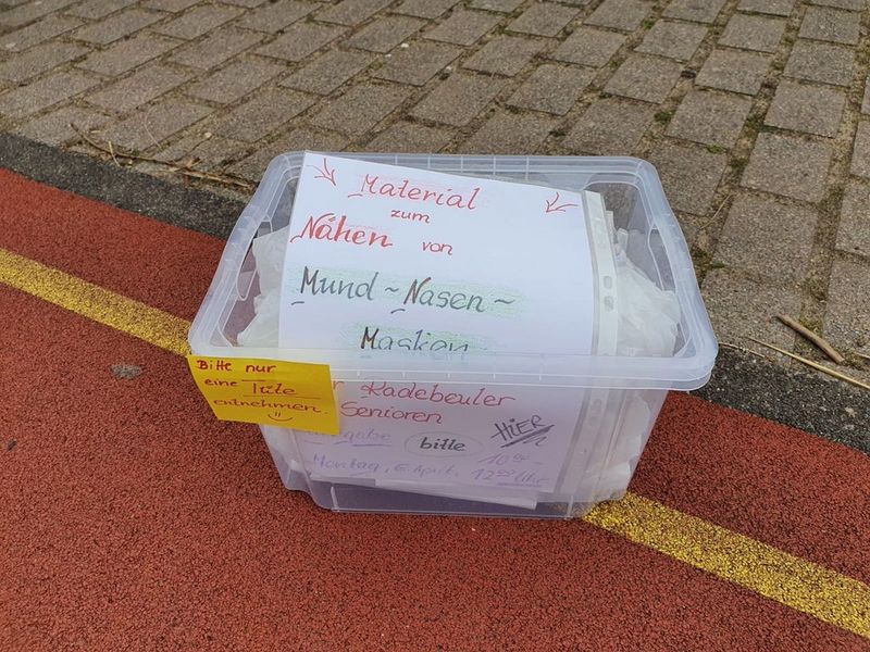 Bereits zugeschnittene Stoffstücke stehen erneut am Montag, 06/04/2020, von 10.00 Uhr bis 12.00 Uhr vor der Schule in einer Kiste zum Abholen bereit. Bitte einzeln herantreten und das Abstandsgebot beachten.