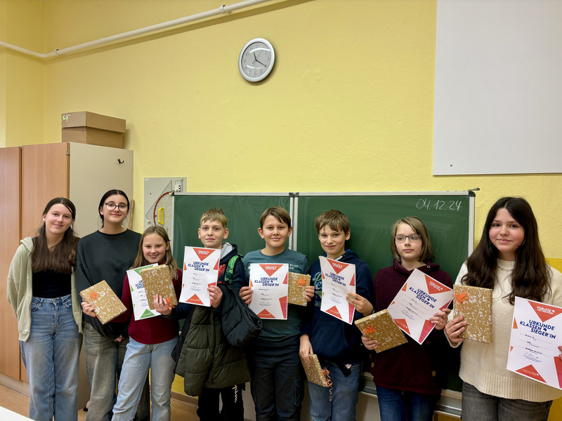 In den 6. Klassen war die Aufregung heute deutlich zu spüren, denn heute fand der Schulentscheid vom Vorlesewettbewerb statt. In zwei Runden traten sechs Schülerinnen und Schüler aus der 6a und 6b an. Während in der ersten Runde ein geübter Text vorgelesen wurde, folgte in der zweiten Runde das Vorlesen eines unbekannten Textes. Vom Flüstern bis zum lauten Rufen – es wurde sehr viel und gut betont. Es ging um außerirdische Begegnungen, einen verzauberten Adventskalender und einen Jungen, der schweben kann.