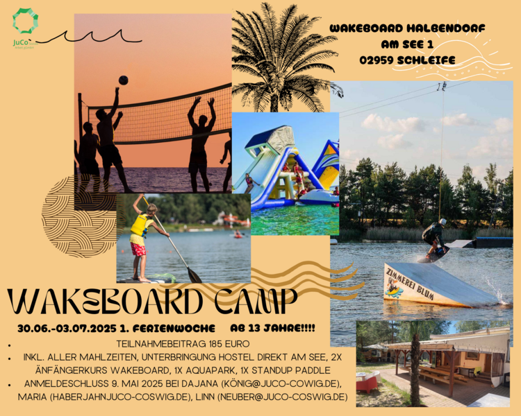 Du hast in der ersten Ferienwoche noch nichts vor? Wir fahren mit euch auf ein Wakeboard Camp. Von Anfängerkursen fürs Wakeboarden bis hin zum Stand Up Paddeln sowie Erlebnisse im Aquapark - ist alles dabei. Meldet euch gern bei mir: Linn Neuber, neuber@juco-coswig.de<mailto:neuber@juco-coswig.de>, 016099019878