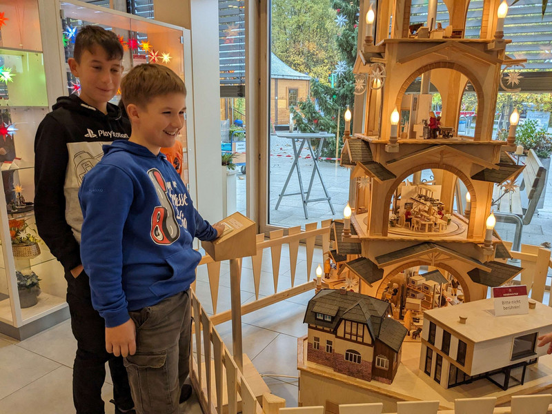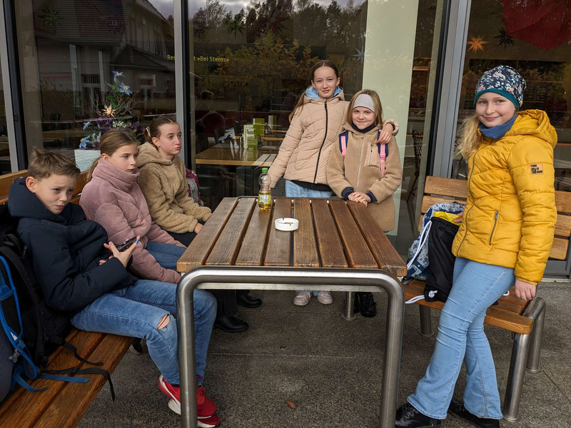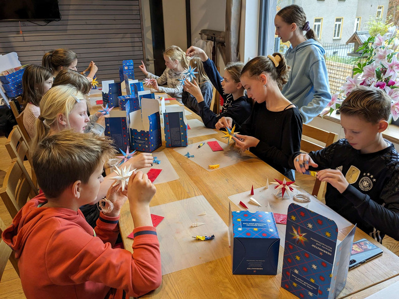 Am Mittwoch, den 08.11.23 starteten wir (die Klasse 5c mit Frau Schiebe und Frau Schmidt) um 8 Uhr morgens in Bischofswerda mit dem Zug nach Löbau, stiegen dort in den Bus nach Herrnhut um und kamen ein wenig hungrig nach einer Stunde Fahrtzeit und 10 Minuten Fußmarsch an unserem Ziel, der Sternemanufaktur in Herrnhut, an. Während Frau Schmidt uns anmeldete, konnten wir noch ein kleines Zwischenfrühstück genießen und schon ging es hinein zum Tasche abstellen und Plätze einnehmen: im Inneren des weltgrößten Herrnhuter Sterns. Dort wurde uns zunächst ganz viel Interessantes über die Arbeit in der „Sternelei“ erzählt. Wir hatten viele Fragen, wie z.B. „Wie viele Sonderanfertigungen der ganz großen Sterne gibt es auf der Welt?“, „Und wie viel kosten diese mit einem Durchmesser von 2,50m?“ So erfuhren wir, dass es insgesamt nur 13 Stück gibt, so wie einer von ihnen im Bundeskanzleramt hängt, und €10.000 kostet.