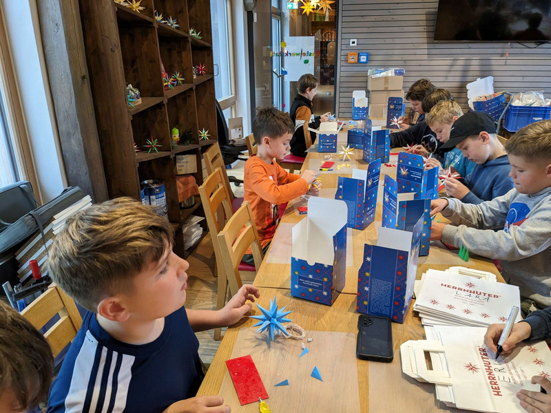 Endlich war die Zeit da, um selbst einen Stern herstellen zu können. Im Bastelraum stellte sich zunächst die schwierigste Frage: „Welche Farben soll ich für meinen Stern nehmen?“. Nachdem jeder seine Wunschfarbe(n) äußern sowie Box, Leim und Zacken abholen konnte, begann ein geschäftiges Kleben und Zusammensetzen. Am Ende war jeder stolz darauf, entweder einen eigenen Stern, einen Stern für das Klassenzimmer gebastelt oder den anderen dabei geholfen zu haben. Zufrieden packte sich jeder seinen selbst gebastelten Stern in die Papiertüte.