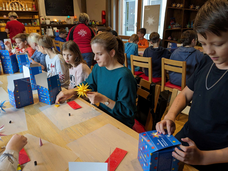 Wir sahen uns einen Film über die Entstehungsgeschichte der Herrnhuter Sterne an und gingen dann hinüber zur Schauwerkstatt, wo wir den Arbeiterinnen beim Sterne falten, kleben und zusammensetzen zuschauen und weitere Fragen stellen konnten.