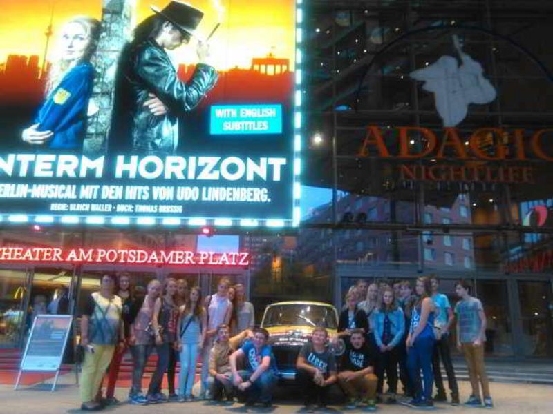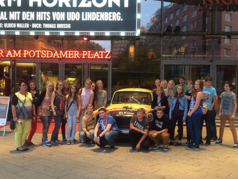 Am 5.September 2014 fand unser schöner Wandertag nach Berlin statt.Aufbruch war 13:00 Uhr mit dem Bus.Nachdem wir 1 und eine halbe Stunde gefahren sind machten wir eine kleine Pause! Nach einer ca.4 Stündigen Fahrt kamen wir in Berlin an.Als erstes merkten wir, was es für komische Leute in so einer großen Stadt gibt, zum Beispiel sahen wir viele Hippies.Dann gab es eine kleine Stadtrundfahrt.Zuerst sahen wir den Fernsehturm. Danach fuhren wir am Alexanderplatz vorbei!Als nächstes ging es zum Brandenburger-Tor,dort durften wir auch aus dem Bus aussteigen und Fotos machen! Dann fuhren wir am Reichstagsgebäude und am Hauptbahnhof vorbei! So gegen 18:00 Uhr sind wir dann am Potsdamer-Platz angekommen dort durften wir dann bis 19:25 Uhr ausgiebig shoppen und etwas essen gehen! 19:25 Uhr waren alle am vereinbarten Treffpunkt nämlich dem „Stage Theater am Potsdamer-Platz“ da und wir konnten nun zu dem Höhepunkt unseres Ausfluges kommen! Wir sahen das Musical „Hinterm Horizont“, das ist Berlins erfolgreichstes Musical aller Zeiten! Und mit den Hits von Udo Lindenberg! Es geht darum, dass Udo Lindenberg zu der Zeit als Deutschland noch in 2 Teile geteilt war, nämlich im Westen die „Bundesrepublik Deutschland (kurz BRD)“ und im Osten die „Deutsche Demokratische Republik (kurz DDR), die eine große Mauer von einander trennte ein Konzert im Osten gab! So was gab es nicht sehr oft denn Udo war West-Deutscher!Auf jeden Fall verliebte er sich bei seinen Konzert im Osten in ein Mädchen aus Berlin Pankow. Die meisten fanden das Musical wunderschön! Um 23:15Uhr ging es dann wieder zurück nach Hause! Viele von uns waren kaputt und müde! Die Fahrt dauerte wieder 4 Stunden, aber in diesen 4 Stunden gab es viel Zeit zum Schlafen und Ausruhen. Als wir dann von der Autobahn abfuhren, brachten wir noch Frau Herzog nach Hause und fuhren anschließend wieder zur Schule, von der wir abgeholt worden! Es war ein wunderschöner, aber auch anstrengender Wandertag! Berlin ist eine Reise wert! Wir danken der Firma „Beck“ und unseren Busfahrer“Herr Wietgrupp“ Danke an Frau Herzog und den Eltern, die uns begleitet haben!