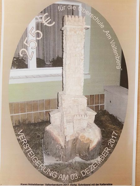 Am 03.12.2017 entstand auf dem Neukircher Weihnachtsmarkt durch eine Schnitzerei mit der Kettensäge der Turm unseres Hausberges, der Valtenbergturm. Frau Karen Hobelsberger ist die Künstlerin, die diese Kunstschnitzerei kreierte.