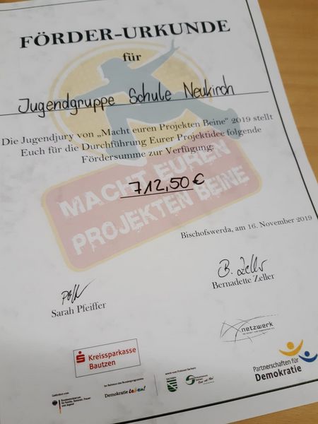 Die vier Kindertageseinrichtungen Neukirchs wollen ein gemeinsames Projekt gestalten. Eine Streuobstwiese soll in gemeinsamer Arbeit entstehen und genutzt werden. Der Schulträger stand diesem Vorhaben sehr positiv gegenüber. Ohne Fördergelder werden die Anforderungen an solch ein Projekt nicht gestemmt werden können. Eine Schülergruppe trug dieses Vorhaben vor einer Jury des Sparkassenverbandes vor und erreichte den 2. Platz. Herzlichen Glückwunsch an die beteiligten Schüler der 7a.