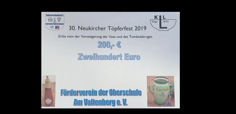 Anlässlich des 30. Neukircher Töpferfestes fand die traditionelle Versteigerung einer Vase und des Tombolakruges statt. Der Erlös betrug 1360 Euro. Ein Spende von 200 Euro geht an den Förderverein der Oberschule "Am Valtenberg". Einen großen Dank an die Töpferei Lehmann.