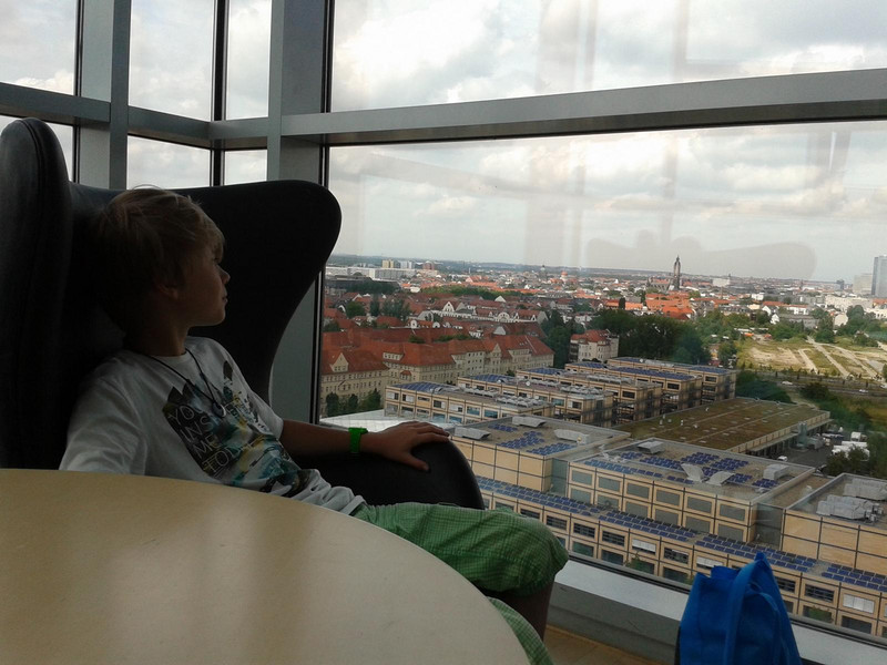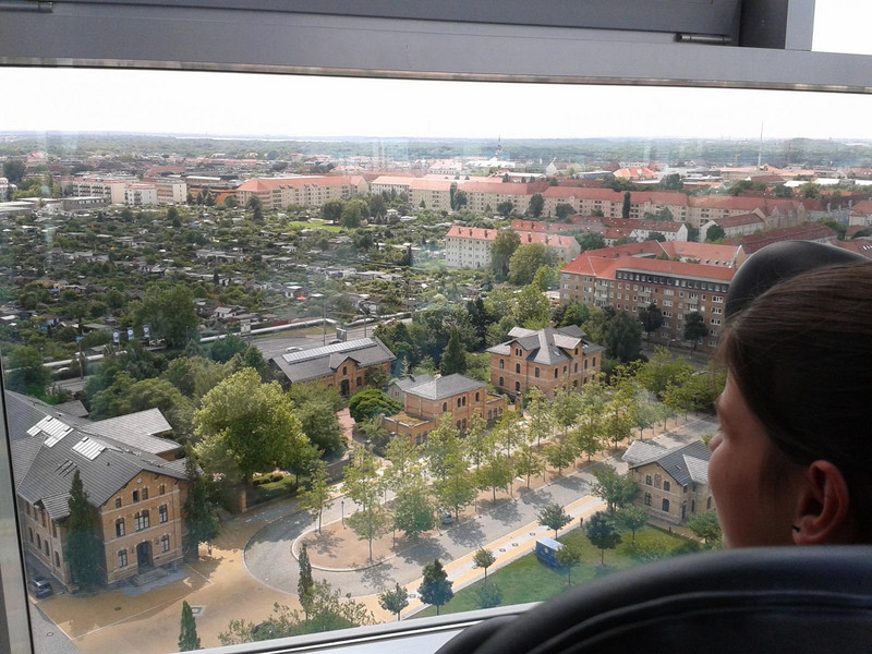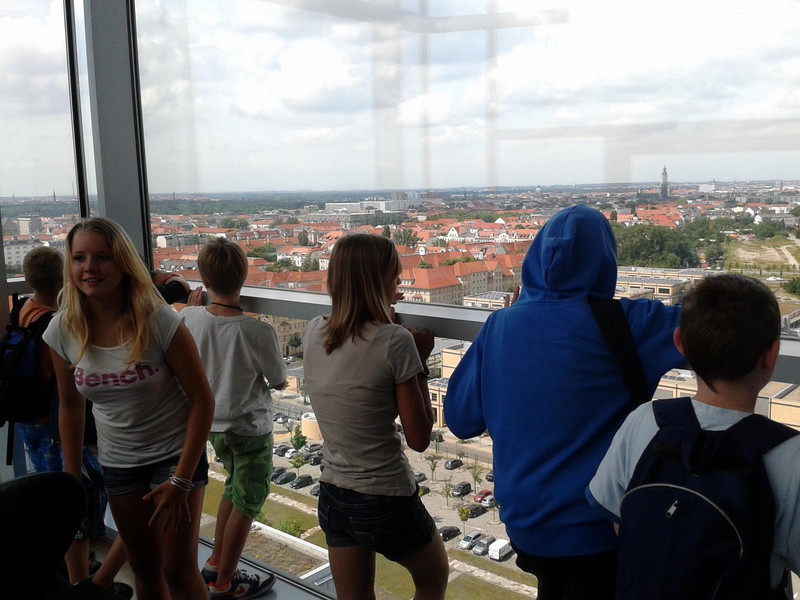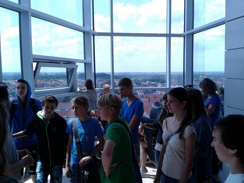Beginnend im Hauptgebäude des MDR konnten die Schüler im 13. Stock die Sicht über ihre Heimatstadt genießen, jedoch stellte die Höhe des Aussichtspunktes nicht für alle eine Verlockung dar! Doch natürlich hatten die Mitarbeiter des MDR weitere sehenswerte und eigentlich nicht-öffentliche Stationen für unsere Führung herausgesucht. So erlebte die Klasse hautnah die Entstehung einer Nachmittagsshow, die Vorbereitung einer der zahlreichen Nachrichtensendungen oder den Drehort des bekannten „Riverboats“. Besonders fasziniert waren die Schüler immer wieder von der Größe der Regionalstudios sowie der teils undurchschaubaren Technikaufkommens innerhalb der Sendebereiche.