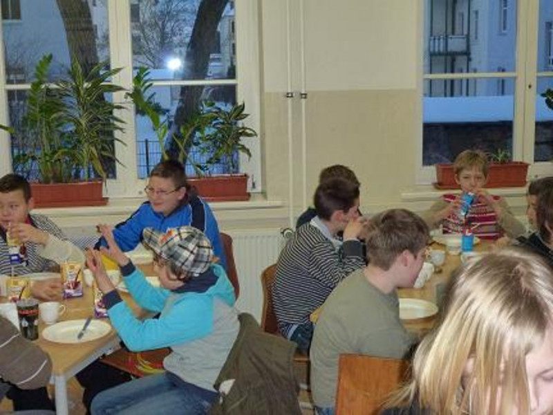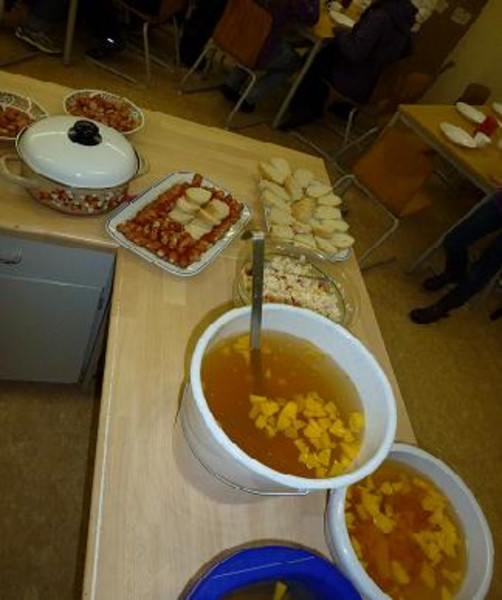 Eine Gruppe beschäftigte sich mit der Zubereitung des Abendessens. Unter der Aufsicht von Frau Dornberg und Frau Rahardt wurden Nudeln gekocht, Würstchen zu Fingern verarbeitet und eine leckere Bowle hergestellt. Außerdem mussten natürlich all die köstlichen Sachen aufgetafelt werden, welche die fleißigen Eltern schon fertig zubereitet mitgegeben hatten.
