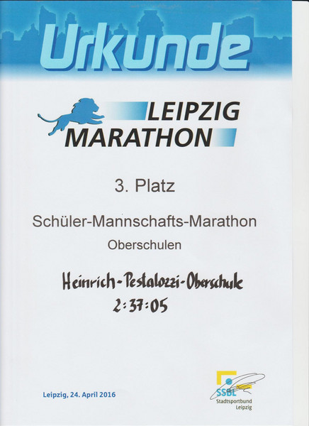Am Sonntag, den 24.04.2016 nahm unsere Schule wieder am Leipzig-Marathon teil. Alle Läufer unserer Schule trafen sich am Stadion um gemeinsam loszulaufen. Alle hatten viel Spaß und das Schönste war, dass wir einen tollen 3. Platz erkämpften.