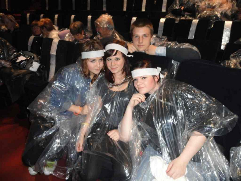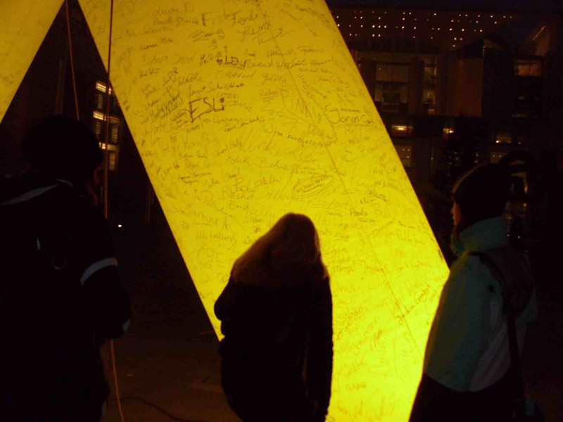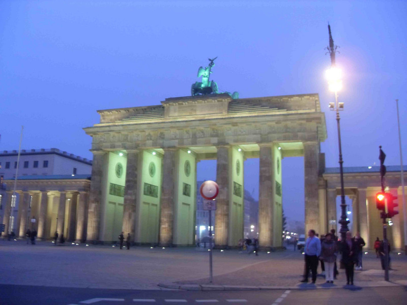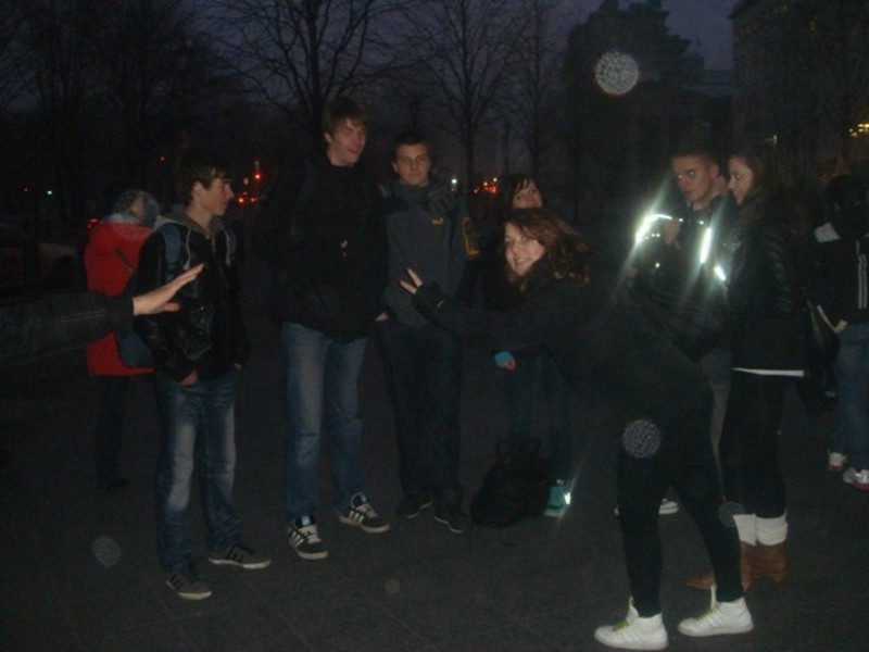 Aber alles klappt. Wir bekommen von einem Mitarbeiter etliche Informationen über die Arbeit und das Ministeriums an sich. Anschließend wollen wir die Holocaust – Gedenkstätte besuchen, aber die ist wegen Umbau momentan geschlossen. Schade! Also bummeln wir langsam in Richtung Brandenburger Tor, zwischendurch noch etwas Essen – viel Zeit bleibt nicht, da wir durch die Sperrung der A14 fast zwei Stunden später in Berlin waren, als geplant. Hell erstrahlt „steht“ das Tor vor uns. Von hier aus ist es nicht mehr weit bis zu unserem Gästehaus, in dem wir für eine Nacht untergebracht sind. Unser Weg führt uns am Kanzleramt und dem Bundestag vorbei. Mittlerweile ist es gegen 17.30Uhr und wir haben Hunger, müssen aber auch an das Abendbrot denken, denn uns steht noch ein toller Abend bevor. Also trifft sich fast alles noch bei Mc Donalds im Hauptbahnhof, dann fix ins Gästehaus und später heißt es dann: „Auf zur Blue Man Group“. Super, wir sitzen in den ersten beiden Reihen! Bedingung sind eine Art Regencapes, wir sehen aus wie Marsmännchen. Als die ersten zermatschten Bananen von der Bühne geflogen kommen, Farbe gespritzt wird, würden einige von uns alles dafür geben, in den hinteren Reihen zu sitzen! Egal, die Show ist ein echtes Erlebnis! Es geht zurück zum Gästehaus, der nächste Tag wird anstrengend.