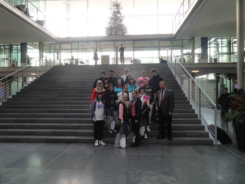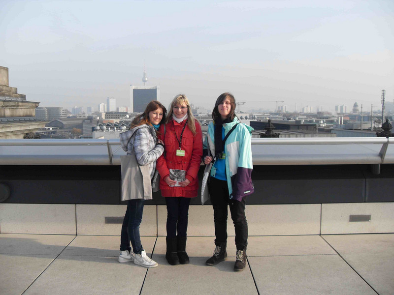 Aufstehen – frühstücken (Wo sind die Jungs, etwa verschlafen?) – Zimmer reinigen – Abfahrt zum ehemaligen Reichstagsgebäude. Unser eigentliches großes Ziel der Fahrt. Spätestens während der umfangreichen Sicherheitskontrollen weiß jeder, welchen Stellenwert das Gebäude und natürlich seine Einrichtungen hat. Hell, groß und weitläufig erscheint es dem Besucher. Wir gehen zum Plenarsaal. Dort dürfen wir 30 min an einer Sitzung des Bundestages teilnehmen. Für viele von uns erschreckend, während einige Politiker ihre Rede halten, gibt es doch tatsächlich Abgeordnete im Saal, die sich miteinander unterhalten, mit Handy telefonieren, spielen, … Praktisch das tun, was auf uns ziemlich unhöflich wirkt und wir ja in der Schule auch nicht dürfen. Anschließend gibt es noch ein Gespräch mit einer Leipzigerin, der Abgeordneten Frau Kudla. Welche Aufgaben hat sie, welchen Einfluss auf die Politik, … Aber auch das Verhalten einiger anderer während der Debatte wird von uns angesprochen. Dann geht es zum Bundestag. Hier werden wir von „unserer“ Abgeordneten zum Mittagessen eingeladen und besichtigen abschließend die Glaskuppel. Wir haben Glück, es ist zwar kalt, aber der Blick über Berlin ist fantastisch.