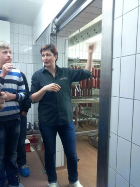 Am 15.01.2015 besuchte die Klasse 8b im Rahmen des WTH - Unterrichts die Fleischerei Dubau in Hoyerswerda. Frau Dubau begrüßte und führte die Schüler durch die Fleischerei. Einmal hinter die Kulissen schauen - das war angesagt. Viel Wissenswertes über die Produktion von Fleisch und Wurst, Salaten usw. erfuhren die Schüler von ihr. Auch, woher das Fleisch und die Zutaten bezogen werden, wieviele Leute in der Fleischerei tätig sind, wie viele Filialen es gibt und und und. Außerdem sahen die Schüler die verschiedensten Geräte und Maschinen für die Herstellung, Kühlräume und Tiefkühlräume. Der Abchluss bildete der Genuss einer Knacker, sofern der Schüler sie aß.