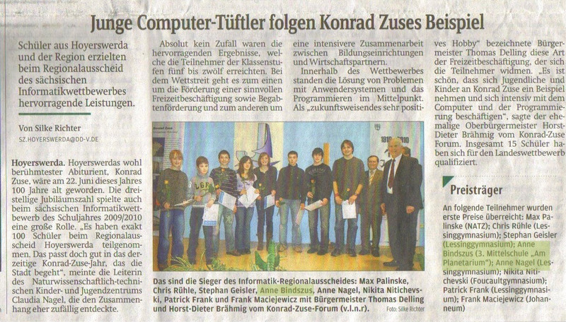 | Alle Schüler, die am Sächsischen Informatikwettbewerb teilgenommen haben, erhalten eine Teilnahmebescheinigung.Wir danken der Computerfirma CNS Hoyerswerda für ihre Unterstützung. | ||