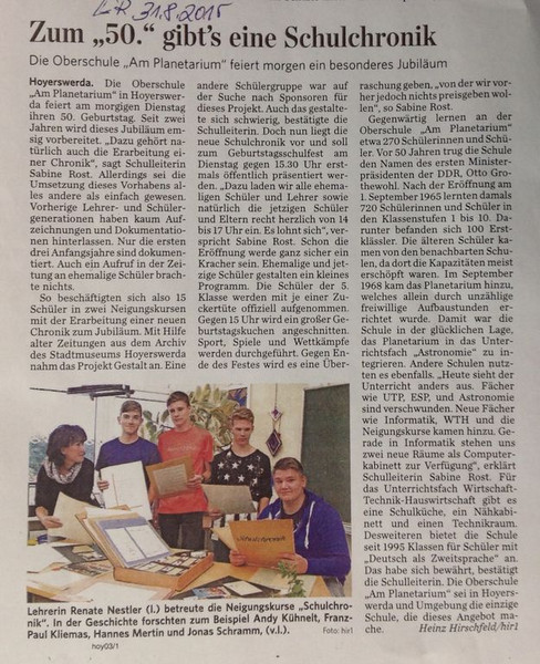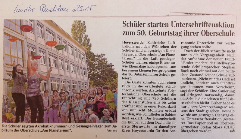 Die Klassensprecher unserer Schule trafen sich am 27.3.2015 zu einer „Ideenkonferenz“, um die Vorbereitung des 50. Jahrestages der Schulgründung am 1.9.2015, zu besprechen. Ergebnisse werden noch nicht verraten. Nur so viel- in den Neigungskursen der 8. und 9. Klassen wird in Zusammenarbeit mit Schülern und Lehrern seit Schuljahresbeginn daran gearbeitet. In den Recherchen zur Geschichte der Schule waren wir überrascht, wie oft unsere Schule in den vergangenen Jahren durch positive Nachrichten in der Öffentlichkeit aufgefallen ist. Das ist auch heute noch so. Wir sind stolz auf die vielfältigen Angebote zur Berufsvorbereitung. Lion Quest ist in den Klassen 5-9 im Unterricht integriert. Hier werden wir Schüler auf viele Fragen des Lebens vorbereitet. Es nehmen traditionsgemäß Schüler an der Aktion „Wider das Vergessen“ teil. Der Tag der Toleranz wurde mit viel Engagement durchgeführt. Wir punkten bei Olympiaden, Wettbewerben und Sportwettkämpfen. Die Ganztagsangebote sind schülerfreundlich und vielfältig.