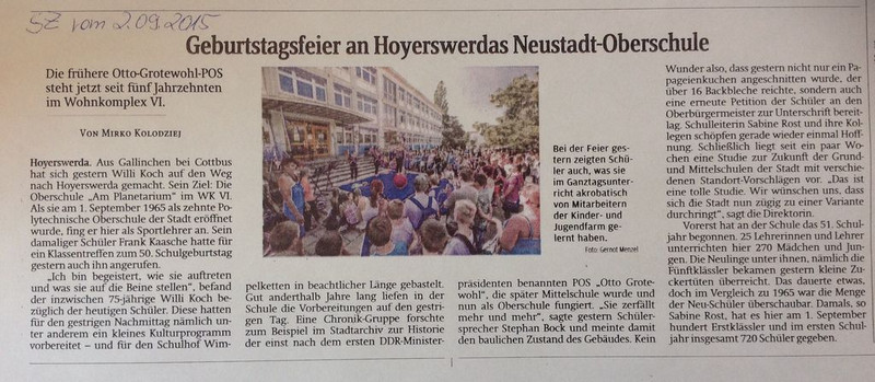 Am 01.09.2015 wird unsere Schule 50. An diesem Tag ist ab 14.00 - 17.00 Uhr ein Fest auf dem Gelände der Schule geplant.