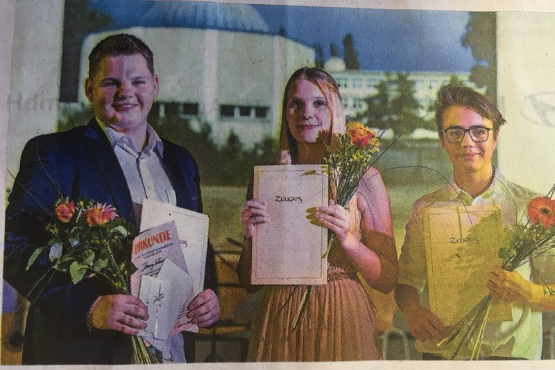 Schon in der vergangenen Woche erhielten unsere Schulabgänger ihre Zeugnisse. Der Förderverein der Schule zeichnete die Besten aus, Denny Wauro mit einem Notendurchschnitt von 1,6 und Jona Soika mit 1,8. Auch Jonas Birkner erhielt eine Auszeichnung für sein jahrelanges engagiertes Arbeiten als Schülersprecher.
